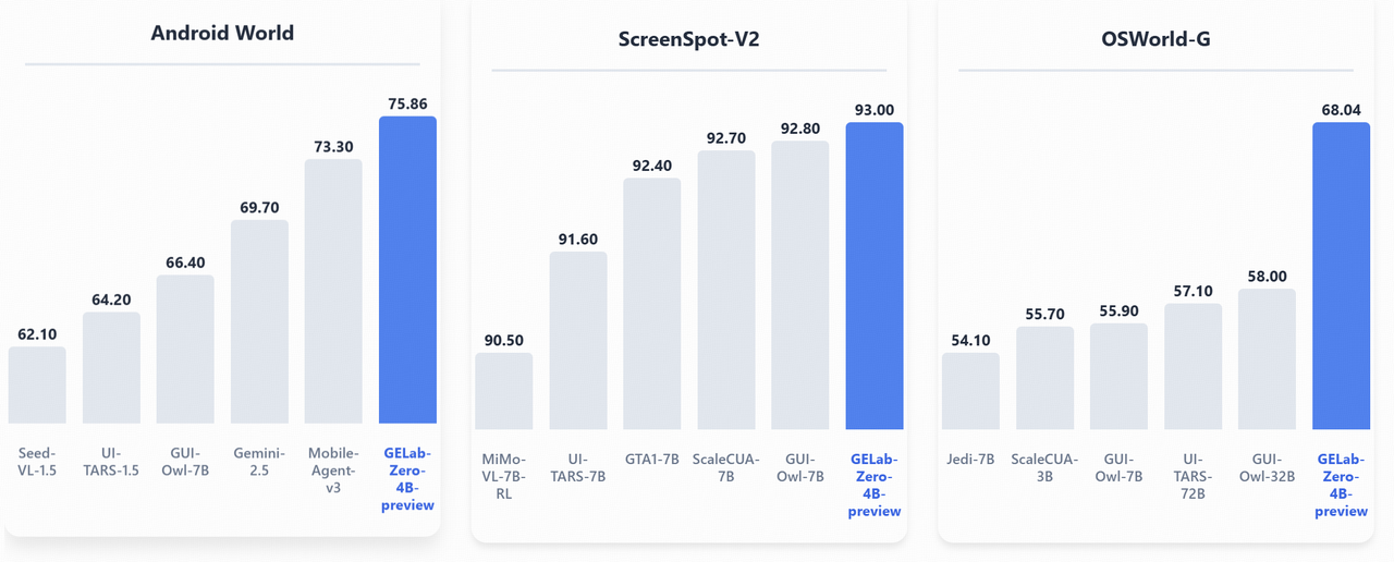 测试结果显示,GELab-Zero-4B-preview在多项权威开源基准测试中超越其他主流模型,拿下同尺寸SOTA。同时,GELab-Zero-4B-preview的表现还超越了参数量更大的GUI-Owl-32B等模型,性能更优也更易部署。