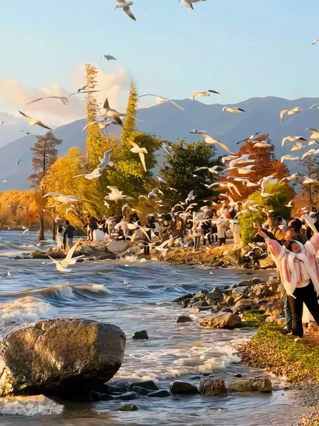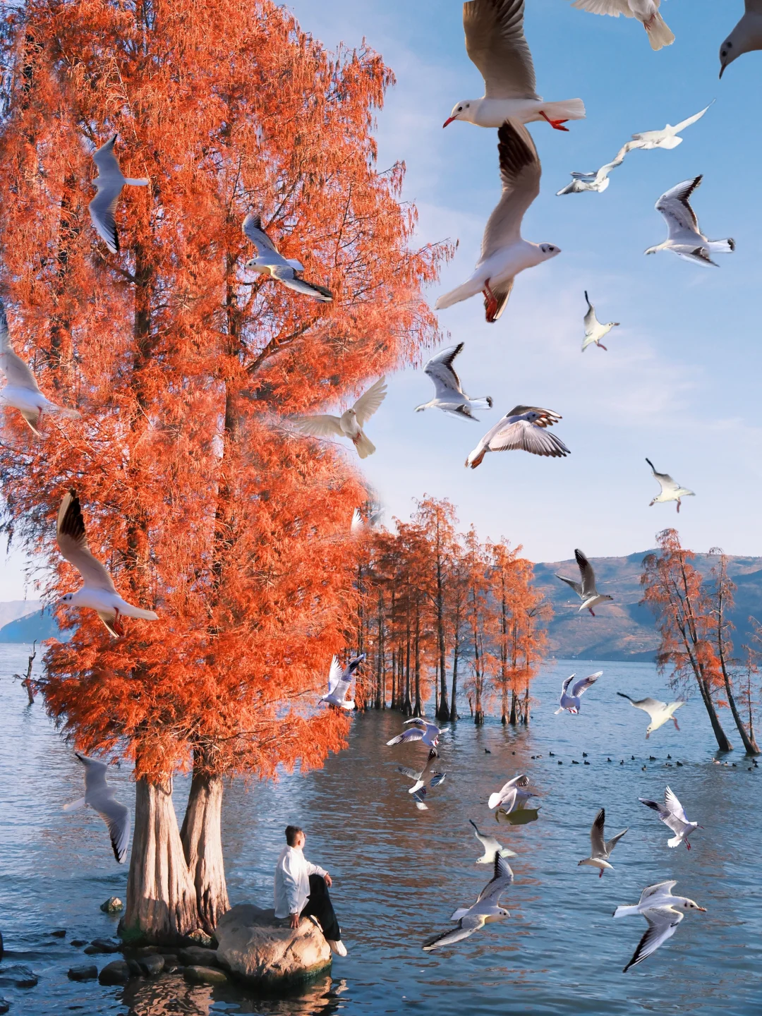 大理洱海日出观景醉家位置,水杉林目前正值最佳观赏期,西伯利亚海鸥目前大量聚集早上最佳观赏期