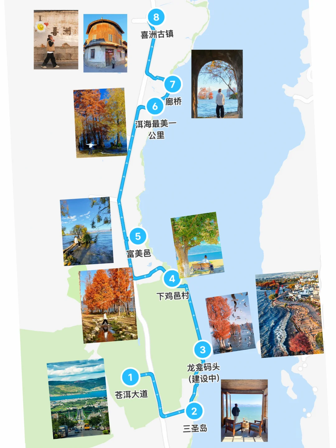 沧洱大道👉三圣岛👉龙龛码头(喂海鸥拍红杉树)👉下鸡邑村👉富美邑👉下泼淜👉洱海最美一公里👉廊桥👉喜洲古镇