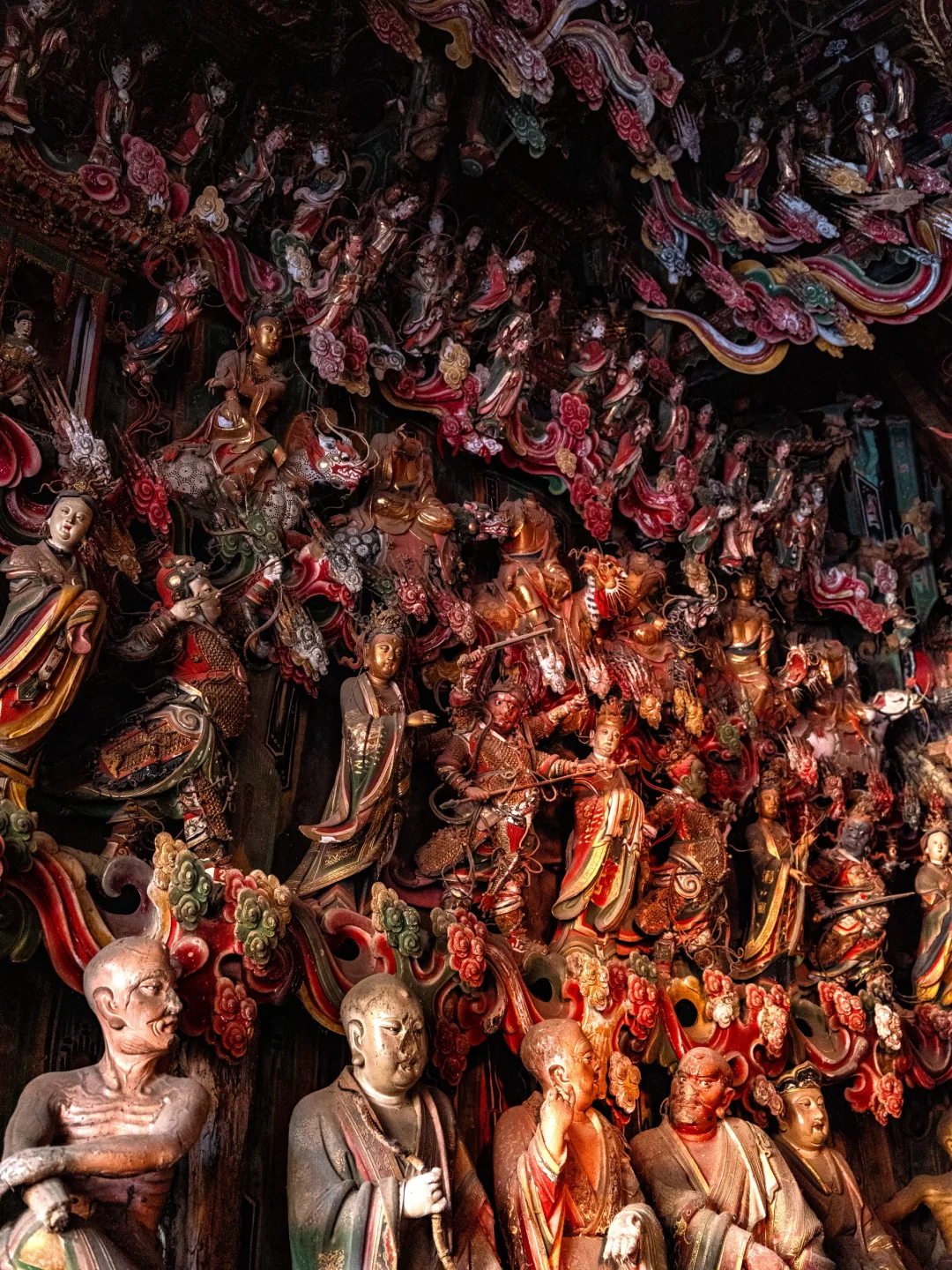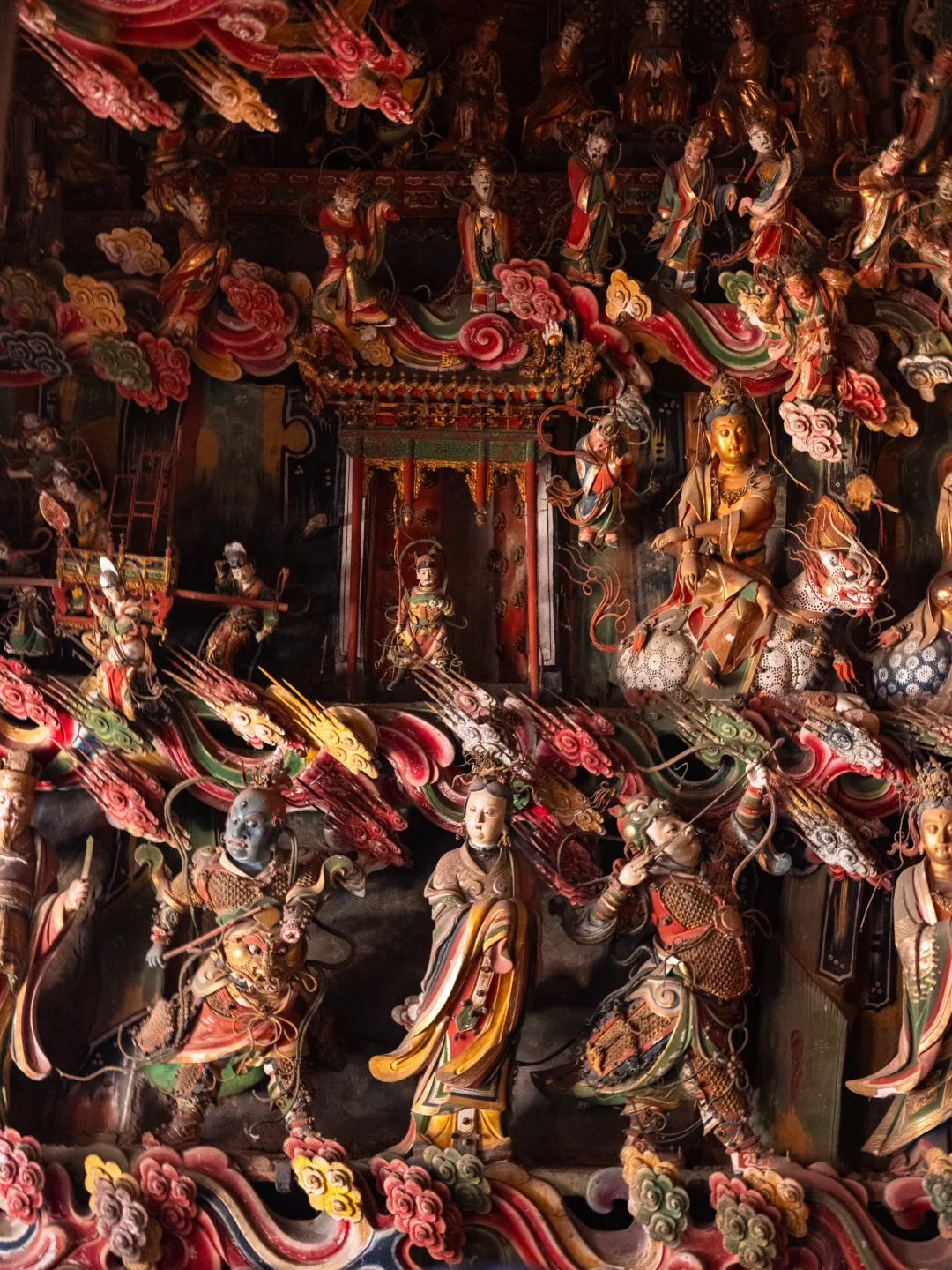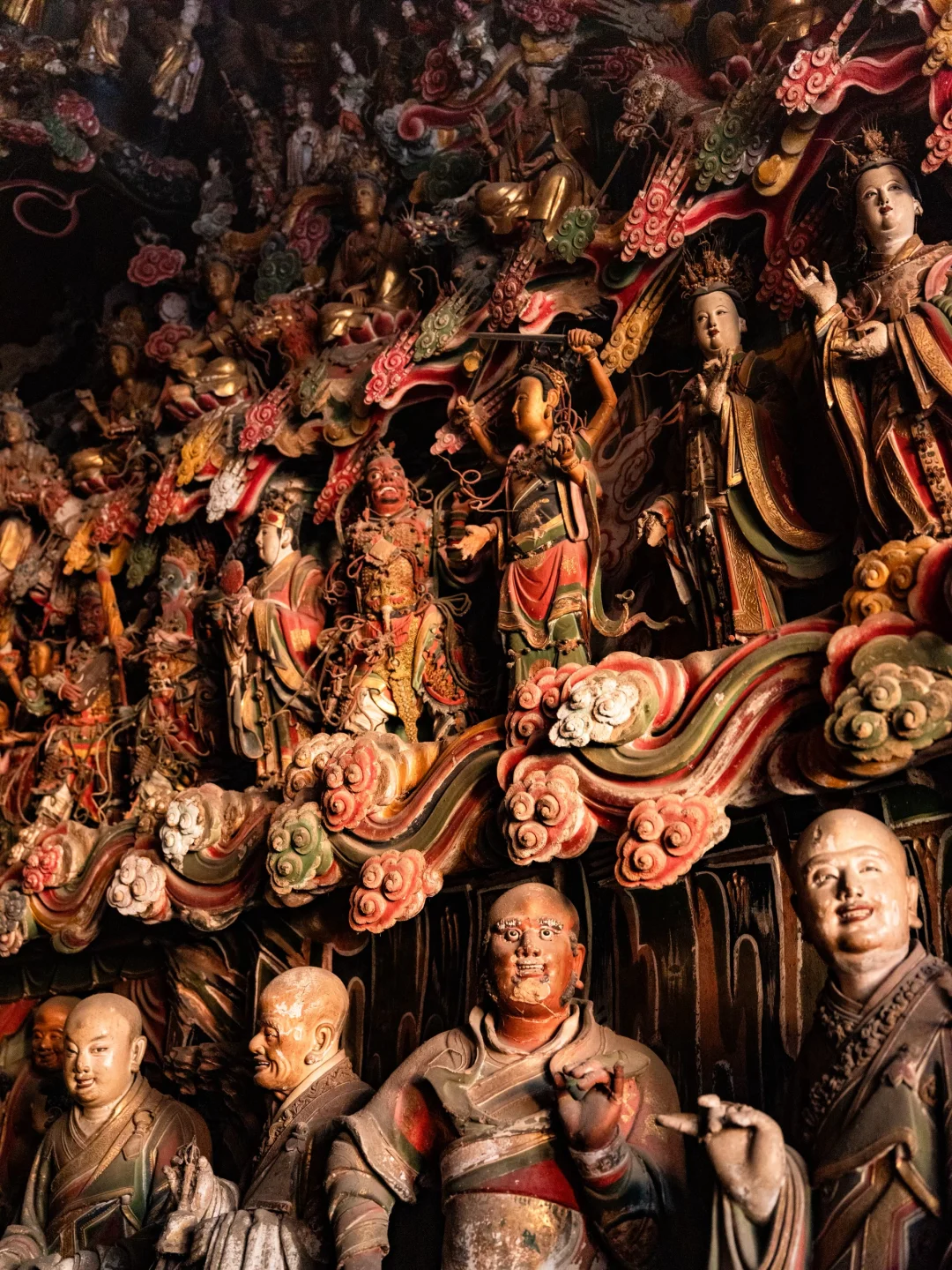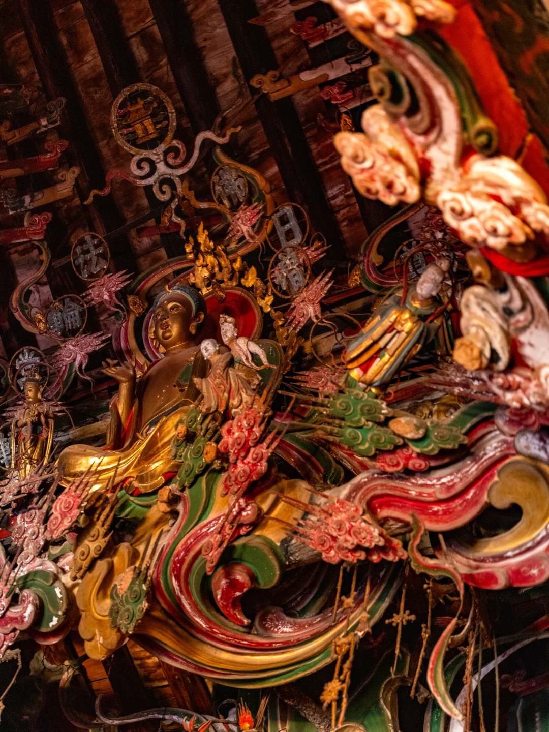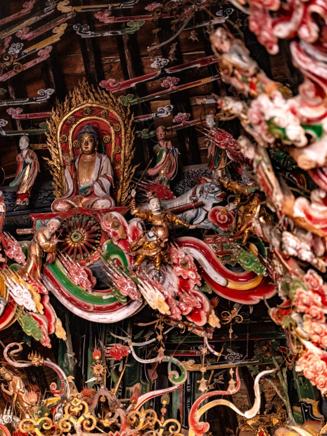 观音堂的悬塑里藏着完整的《西游记》故事线彩蛋:文殊菩萨坐骑身下躲着的机灵猴子、红色祥云后探出的金色猴头、憨态可掬的八戒
