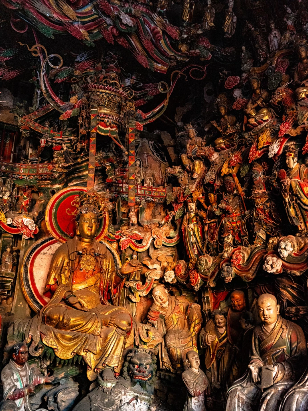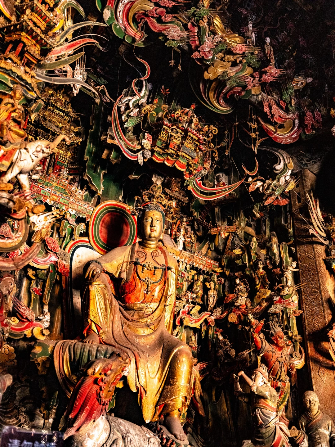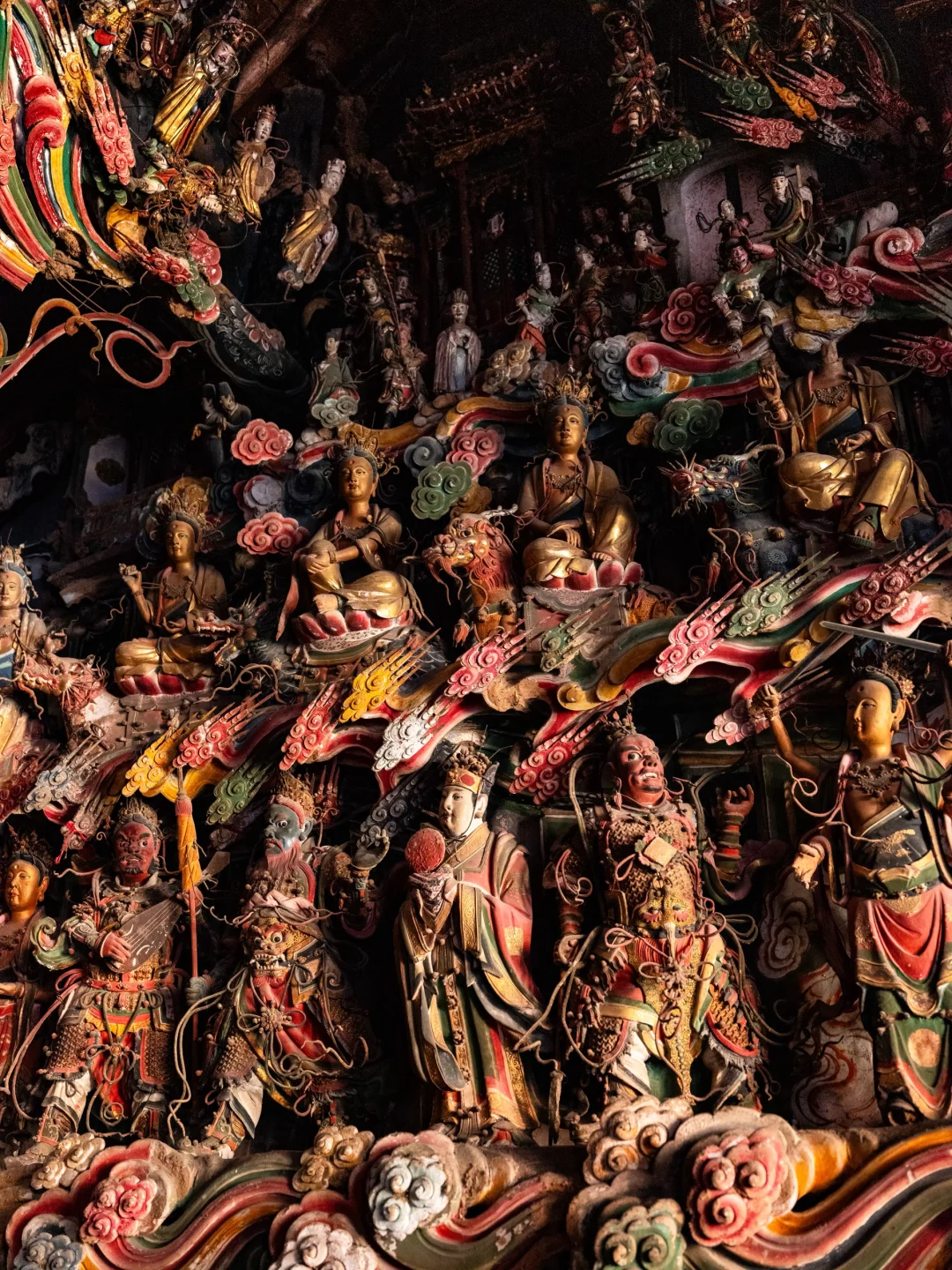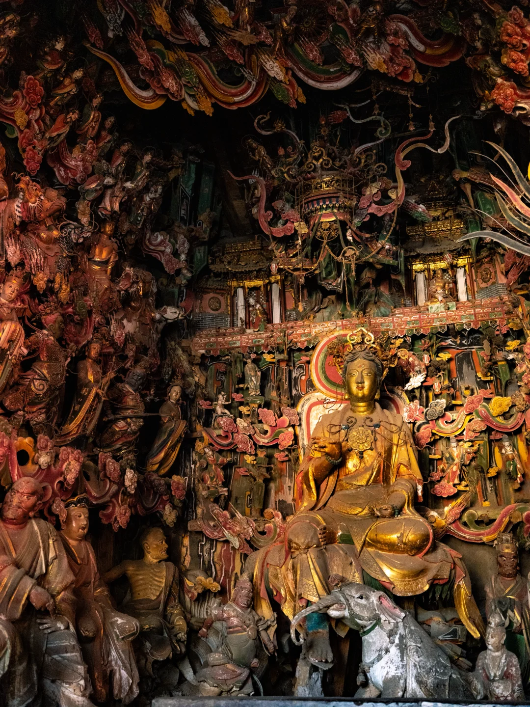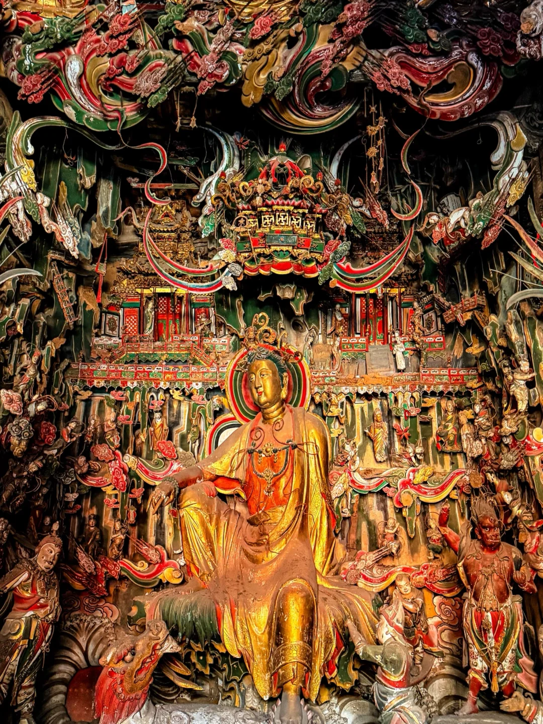 观音堂的悬塑里藏着完整的《西游记》故事线彩蛋:文殊菩萨坐骑身下躲着的机灵猴子、红色祥云后探出的金色猴头、憨态可掬的八戒