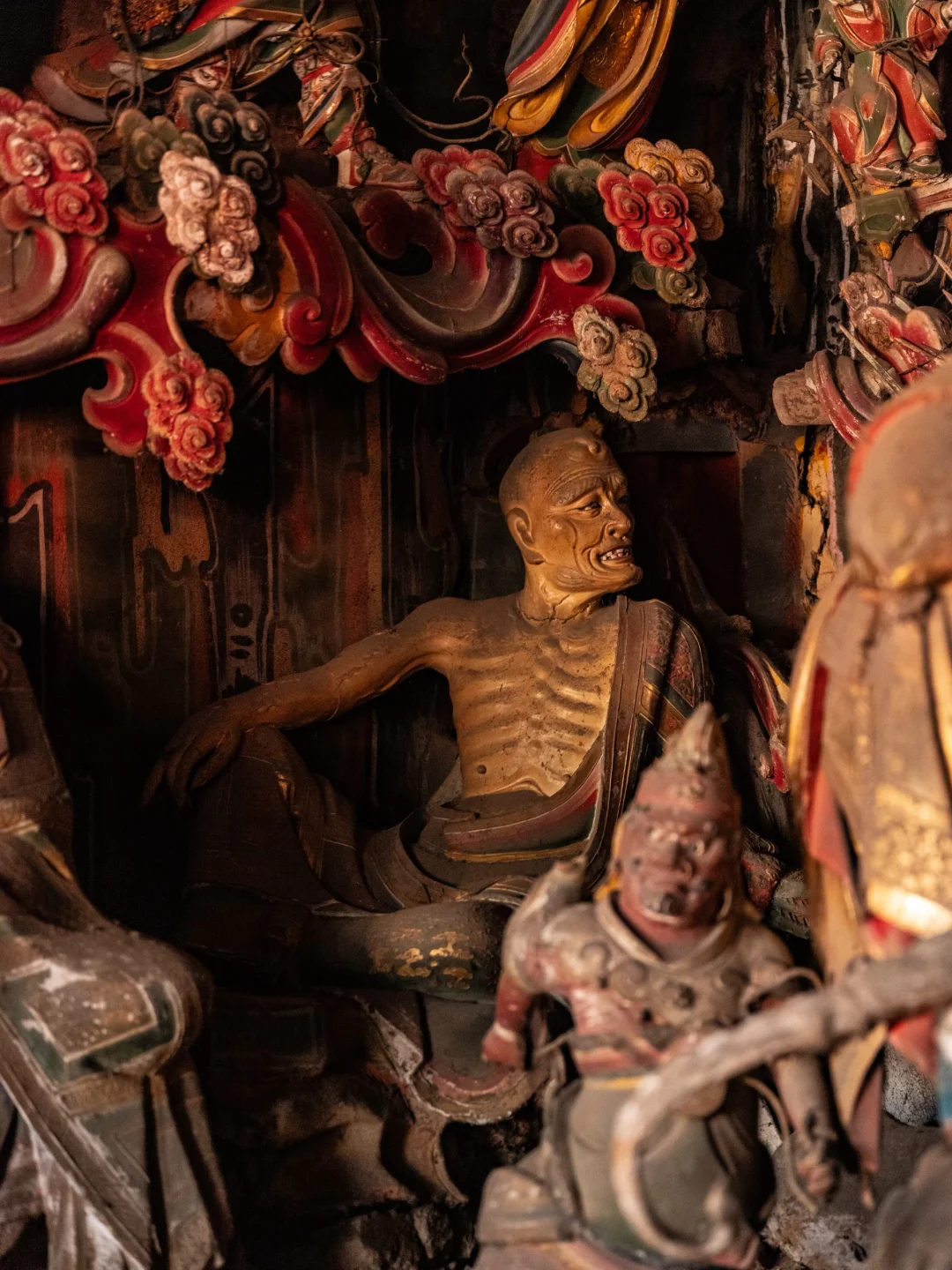 三大士南北两侧分列着十八罗汉(各九尊)体量略小于观音造像。似在争论不休、喜怒哀乐皆藏于眉眼动作间,“立体的表情包”