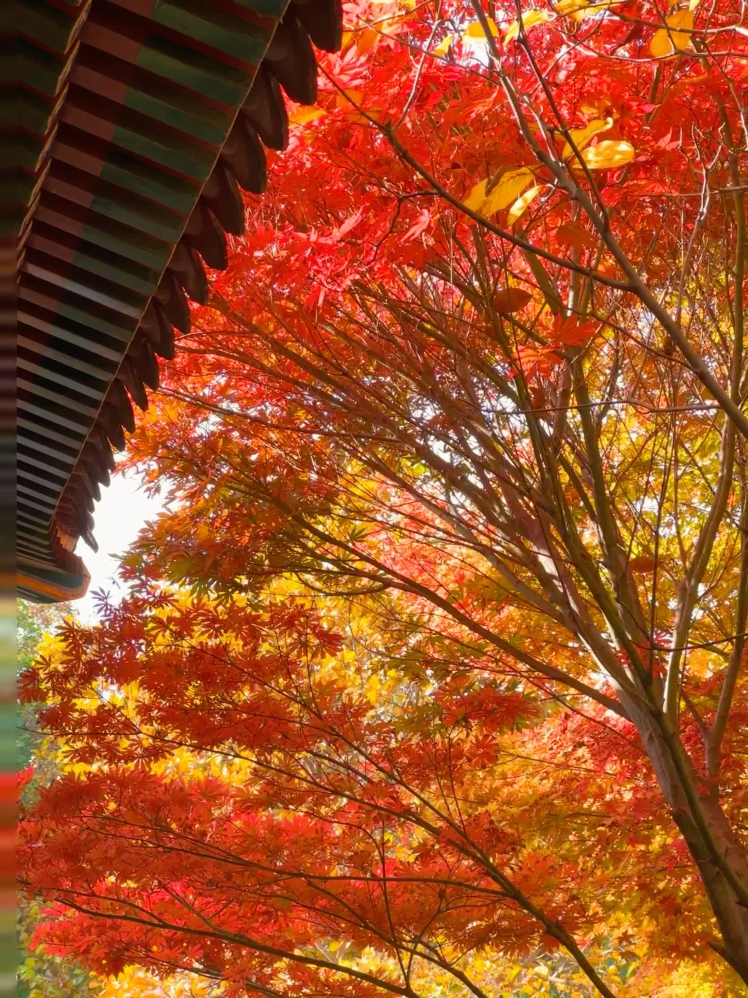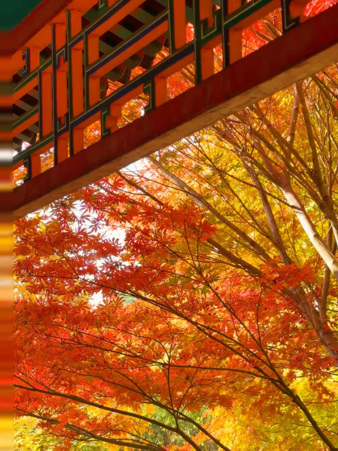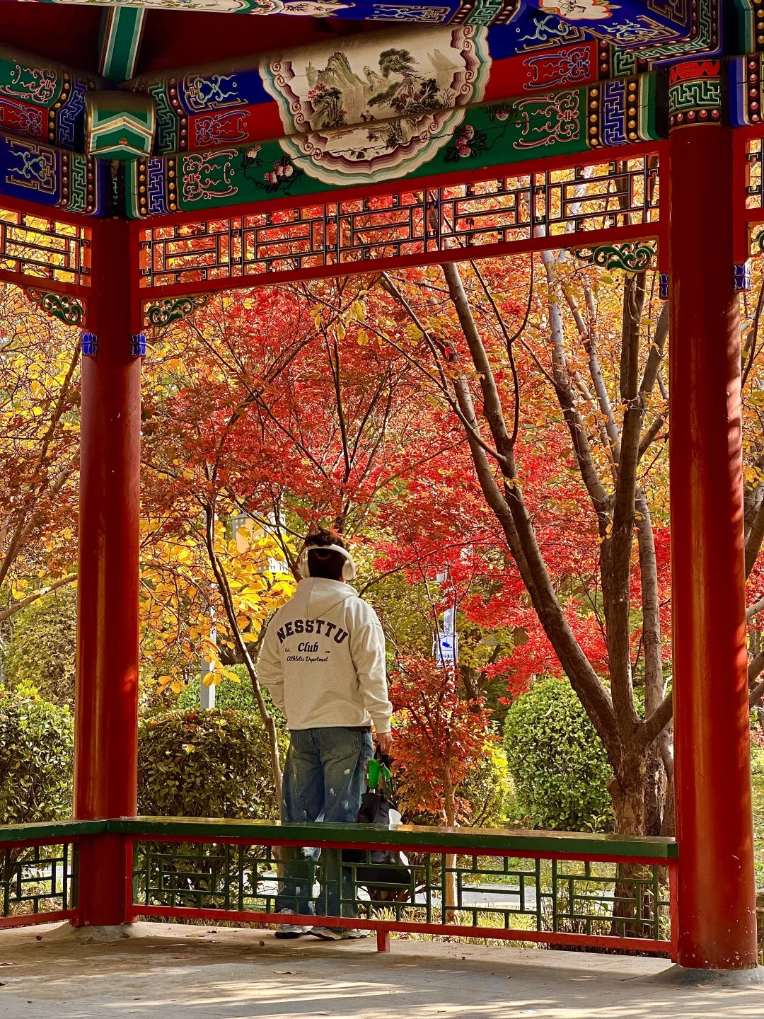 👉这里相比紫竹院公园,枫叶虽然面积不大。但搭配古风的长廊和亭子能拍摄的角度更丰富~