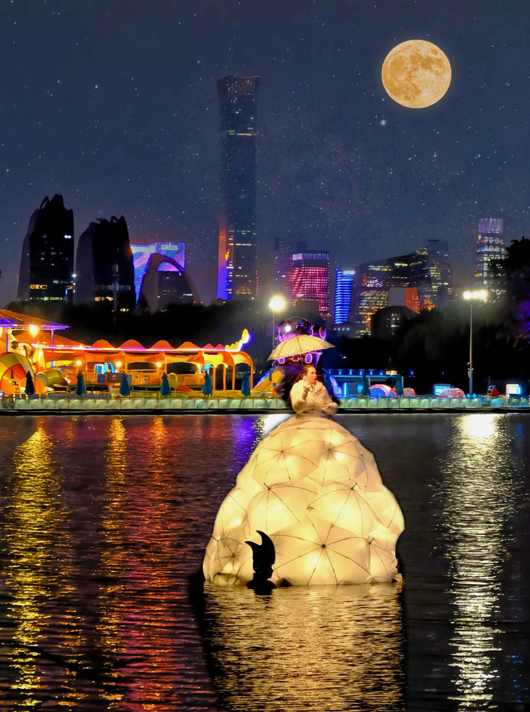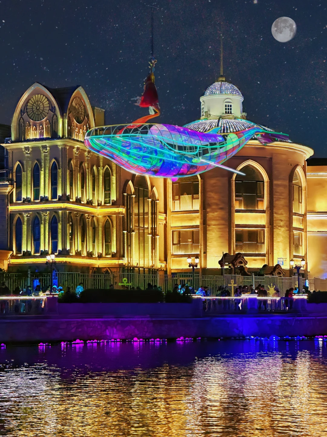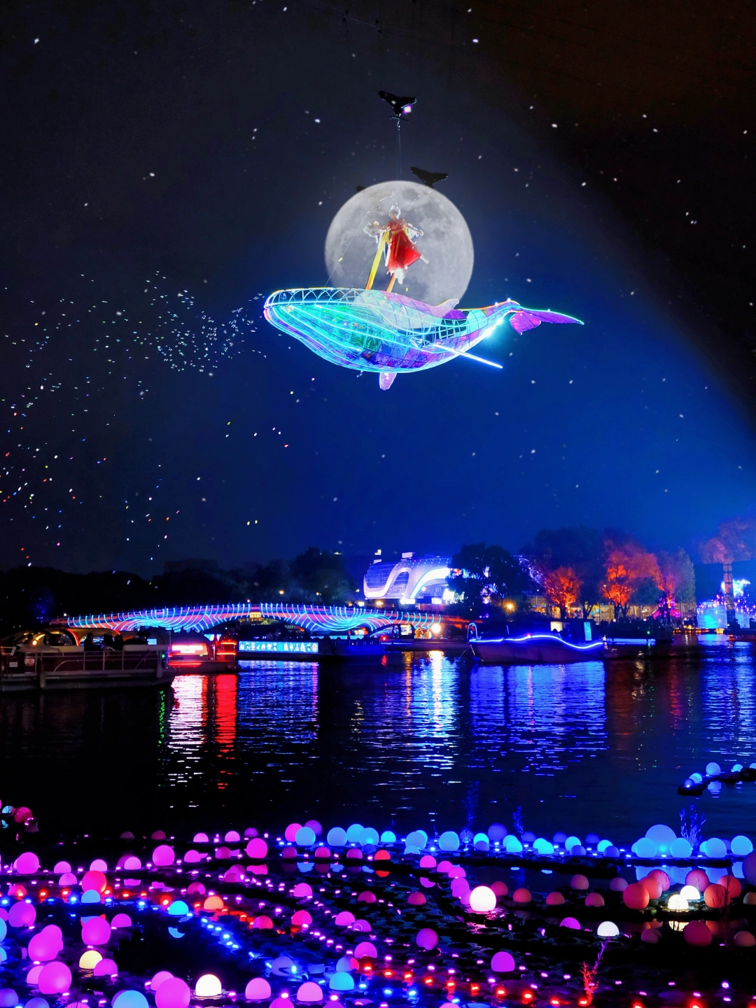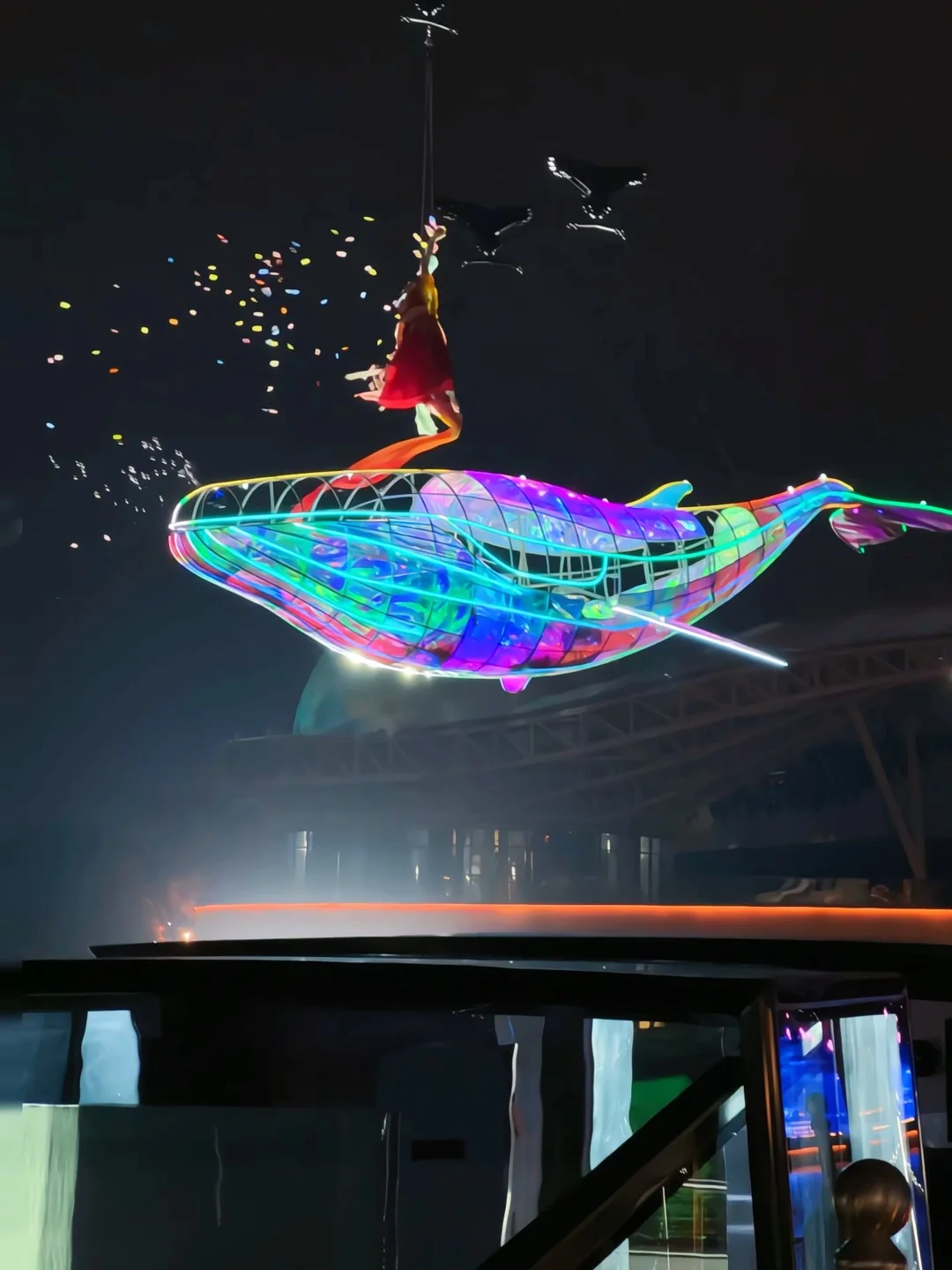 2. 步行到蓝港码头,蹲19:05的「飞跃蓝湖」空中表演,10米长的「鲲鹏」光影超梦幻