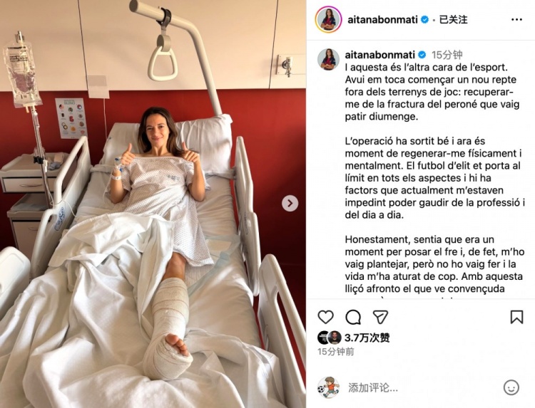 直播吧12月2日讯邦马蒂在西班牙女足集训期间不幸遭遇腓骨骨折。巴萨官方宣布,邦马蒂已成功接受左腓骨经骨间隙骨折手术。邦马蒂刚刚更新社交媒,晒出手术后照片并发长文表示手术已顺利完成,自己将会重新归来。