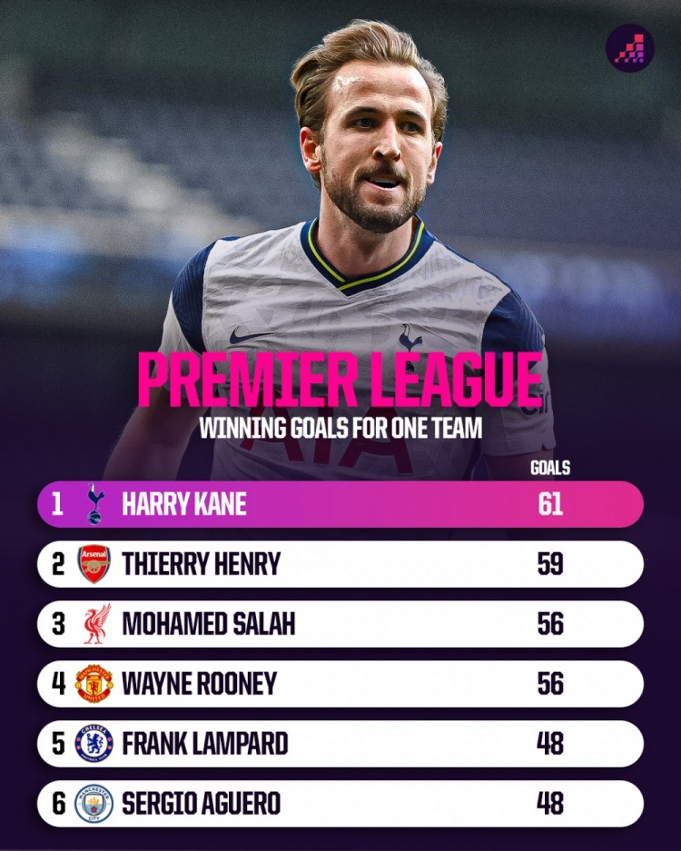 直播吧12月2日讯在足球比赛中,为球队打进制胜球无疑是最令人激动兴奋的。据Opta数据统计,英超历史上,为单一俱乐部贡献制胜球最多的榜单中,英格兰射手凯恩为热刺队打入61粒制胜球,位列榜首。