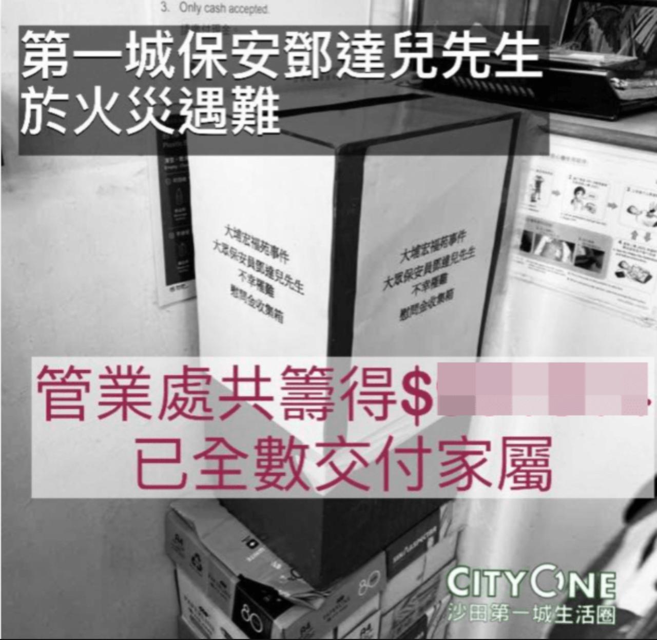 【港闻】【大埔宏福苑五级火|沙田第一城保安员罹难遗妻女 管业处筹近百万数捐款】 (香港人真的有很多爱心、内疚及钱) 大埔宏福苑五级大火夺走逾百条人命,死伤枕藉,其中一名罹难者为沙田第一城33座夜更保安邓达儿。消息传出后,屋苑居民深受触动,纷纷到大堂捐款箱表达心意,截至昨日,慰问金合共达接近一百万元,已全数转交死者家属。 沙田第一城物业管理公司早前证实,邓达儿为屋苑33座的夜更保安,在宏福苑大火中不幸罹难,遗下妻子及仍在就学的女儿。消息一出,大批街坊前往33座大堂捐款,希望为其家属提供支援。 由于捐款人流众多,原本设于33座的大堂捐款箱一度不足应付,管理处其后将捐款箱移至靠近41座的保安控制室,方便居民持续捐助。 Facebook「沙田第一城生活圈」群组引述管理公司昨日(4日)发出的公告指,于12月4日上午,在第一城委员会代表、管理处代表及大众安全警卫有限公司共同见证下,已正式点算慰问金,金额接近7位数,并已由大众安全警卫有限公司代为转交邓先生家属,「愿死者安息,生者坚强」。 香港大埔起火 殉难 捐款 香港