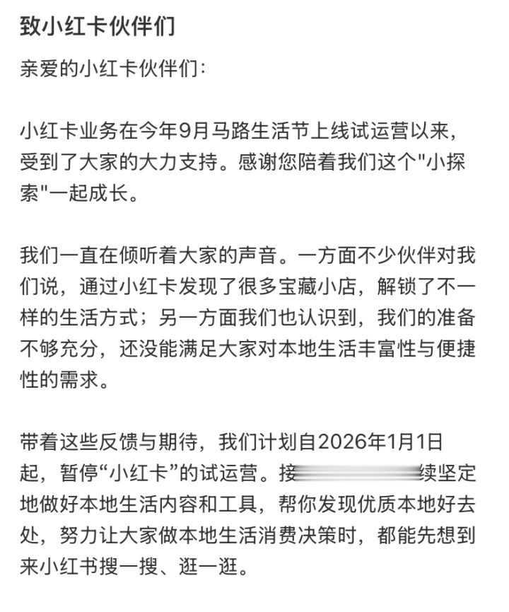 在最新公告中,小红卡团队表示,由于准备不够充分,没能满足用户对本地生活丰富性与便捷性的需求,计划自2026年1月1日起,暂停“小红卡”的试运营。接下来团队会继续坚定地做好本地生活内容和工具。