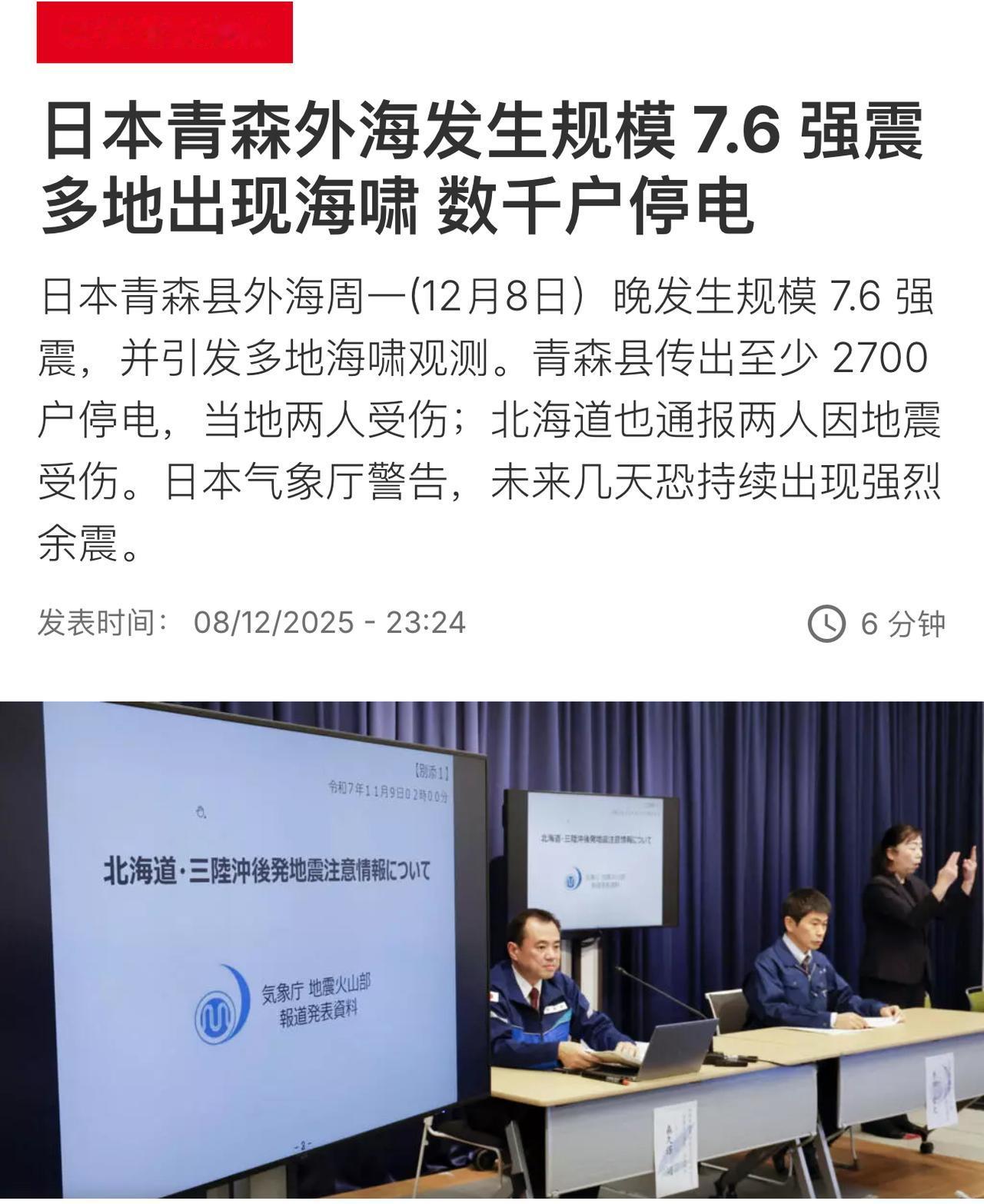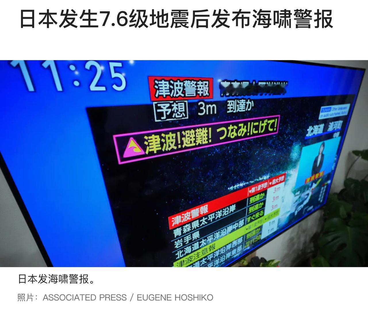 【观世界】【当7.6级地震发生时,有人怀疑是被核攻击⋯⋯】 日本气象厅表示地震震级为7.6级,震央位于北海道附近、青森沿海城市外海。震源位于海面以下约50公里处。首都东京亦有震感。 日本强震警报 地震 日本 北海道
