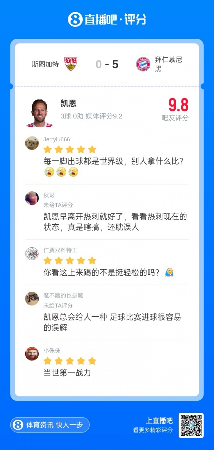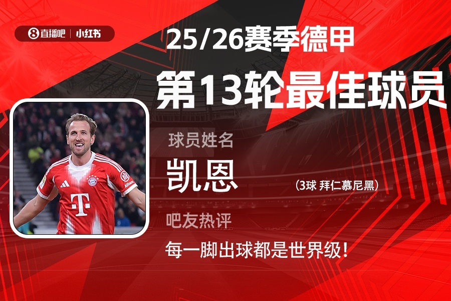 第13轮评选结果结出炉,凯恩替补登场30分钟上演帽子戏法,助拜仁大胜斯图加特,获得吧友超2.7万票支持,当选[直播吧X小红书德甲第13轮最佳球员]!