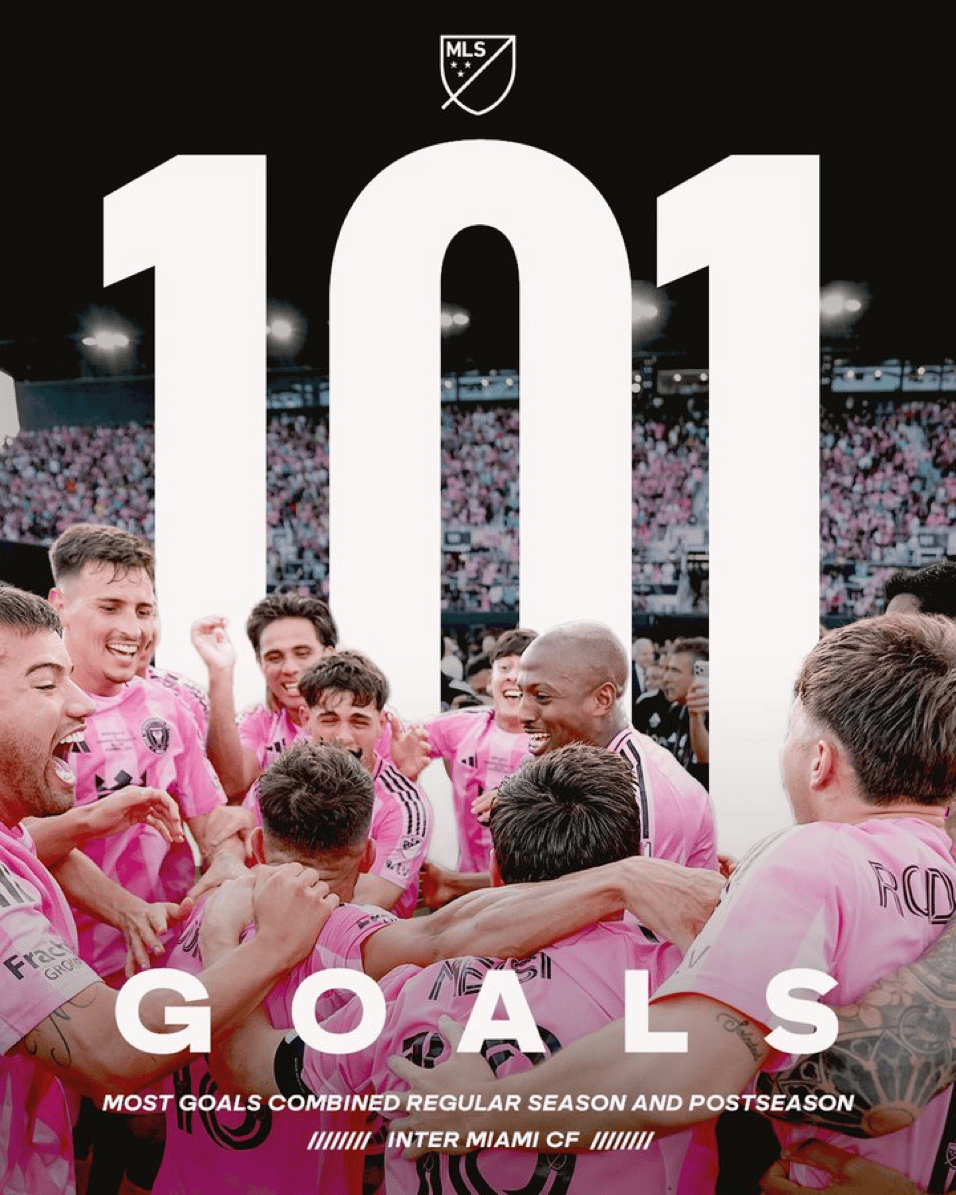 根据赛事官方的统计,迈阿密国际本赛季在常规赛和季后赛合计打进101球,创造了赛事历史上单赛季进球最多的纪录。