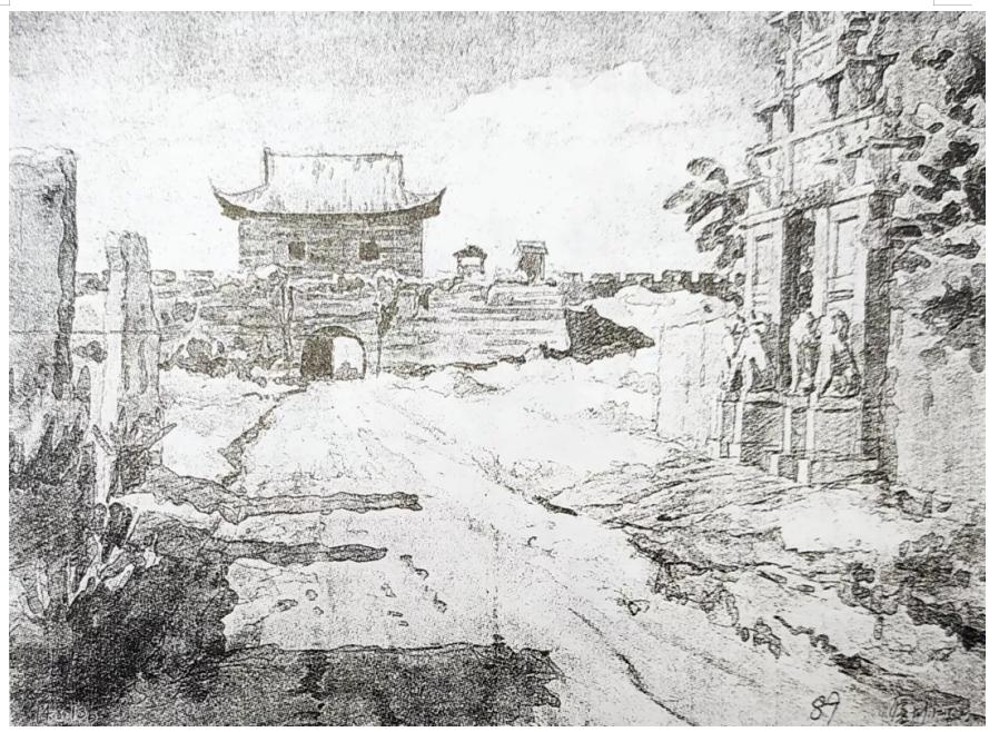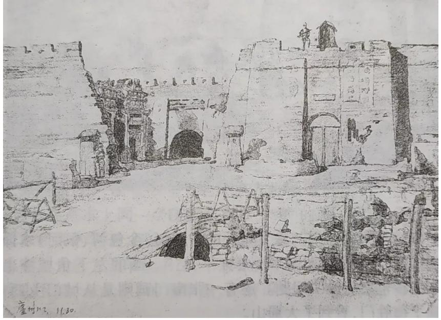 从市内街道的一角看德胜门。此门因交通禁令,现在不通,故路旁长满了草,再加上断壁残垣,更令人倍感寂寞。但夏草繁茂,煞是好看。跟右边的那座高高的鸟型石门一样形状的门,我在画里常常画到,但这座石门规模大,雕刻也精美……这座门当然也驻扎着日军的守卫士兵,城门右上角的两个小屋,为临时造的看守的哨所。