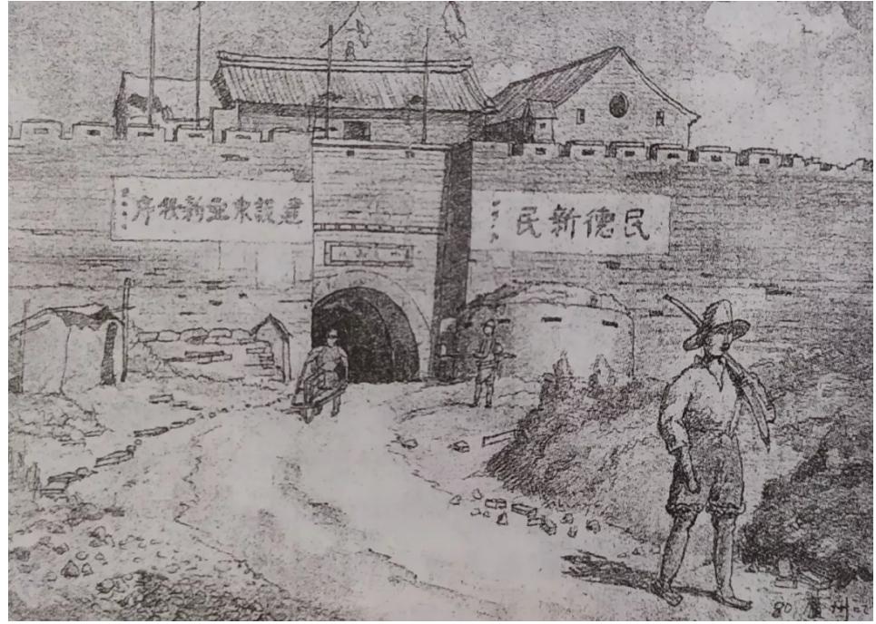 这是要进入庐州城内时,从停车场向前走去时所见的正面主要大门。城墙上涂写着的广告文字,是最近由县政府新写的标语。门的右边看到的圆形物是一座防御用的碉堡,这是友军造的。左边是用于同样目的的土垒掩体,城墙上有两面旗子友好地并排挂着。(楷体部分为画作背面日文翻译,下同)