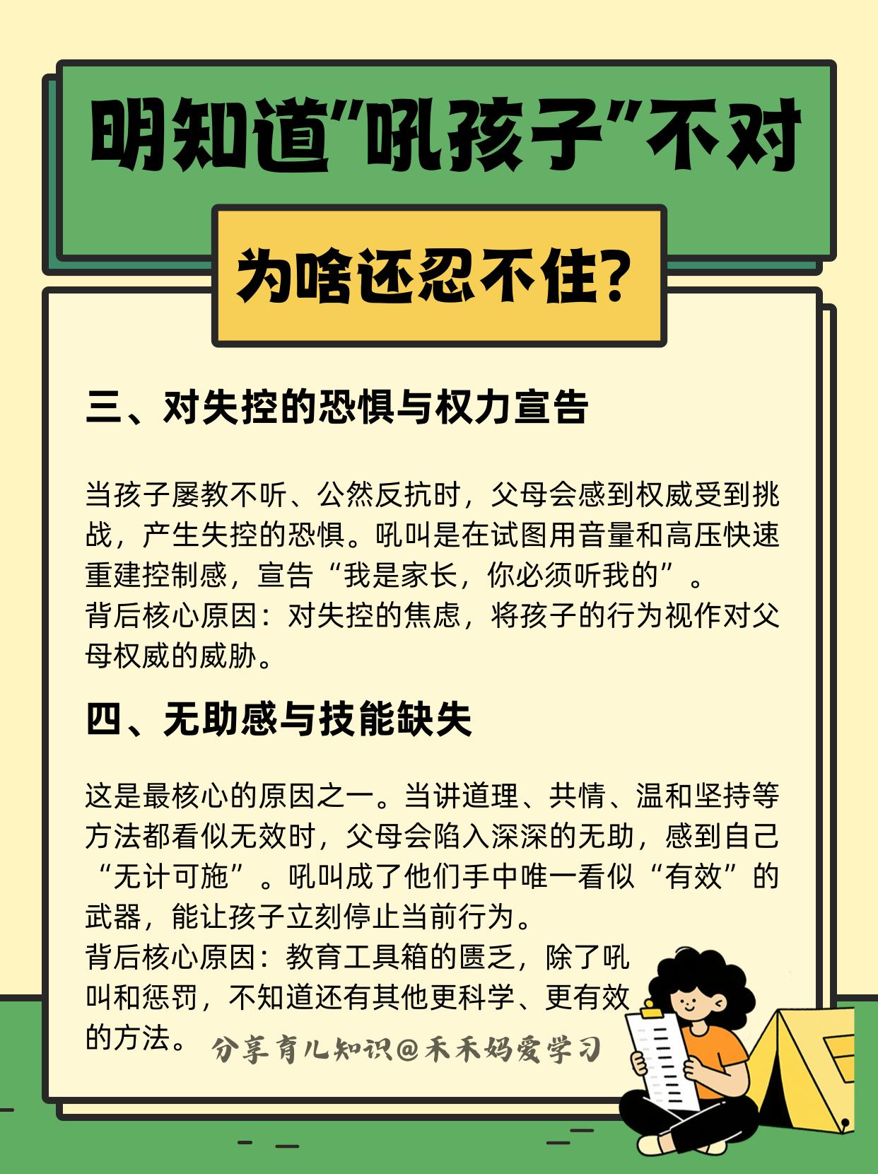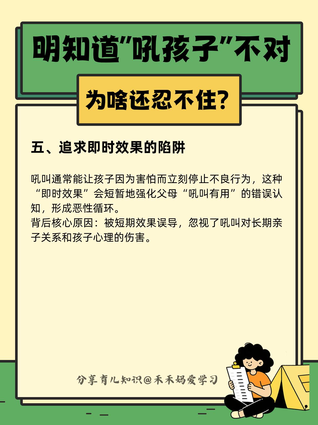 为什么你明明知道吼孩子不对?却还是总忍不住吼ta?不弄清背后的真实原因,你就很难戒掉吼孩子的坏毛病! 哈佛大学医学院马丁·泰彻团队通过脑影像与长期追踪发现;父母频繁吼叫、辱骂孩子,会在以下三方面对孩子造成可测量的伤害: 第一,让孩子越来越傻 马丁教授发现:经常被吼叫的孩子,大脑中负责信息互通、记忆与情绪调剂、决策的区域体积明显缩小,导致孩子记忆力下降、反应速度变慢,语言理解与执行力变差,难以抑制冲动; 第二,学习成绩下降 大脑受损导致智商下降,智商下降自然会影响学习成绩,另外,孩子长期处于被吼的高压环境中,大脑中的海马体也容易变得疲劳,兴奋度下降,导致孩子课上分心,作业畏难,形成越吼越差的恶性循环; 第三,情绪问题 经常吼叫,会导致孩子杏仁核过度敏感,形成2种极端性格,一是攻击型人格,表现为容易被控制情绪,易怒、过度警觉;一种是回避型人格,拒绝社交,甚至自卑抑郁。 为了不让孩子出现上述3种问题,希望看到这条内容的父母能认真看看下图中“吼孩子背后的核心原因”,看看自己到底是因为啥忍不住吼孩子? 然后对症下药,从现在开始做出改变,成为一个真正爱孩子的父母。