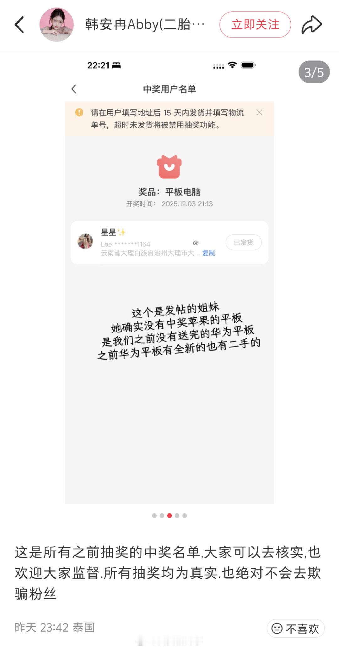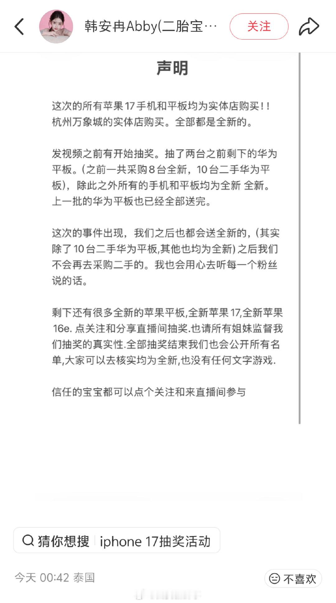 【韩安冉称不会玩文字游戏】韩安冉承认送粉丝二手平板近日,有网友发帖称:在韩安冉直播间抽中平板电脑,结果收到的是二手华为平板。韩安冉送粉丝二手平板电脑引发热议。对此,韩安冉连发多条声明回应,并晒出购买记录以及中奖名单。她称:“这次的所有苹果17手机和平板均为实体店购买。发视频之前有开始抽奖。抽了两台之前剩下的华为平板。(之前一共采购8台全新,10台二手华为平板),除此之外所有的手机和平板均为全新。上一批的华为平板也已经全部送完。这次的事件出现,我们之后也都会送全新的,(其实除了 10 台二手华为平板,其他也均为全新) 之后我们不会再去采购二手的。”