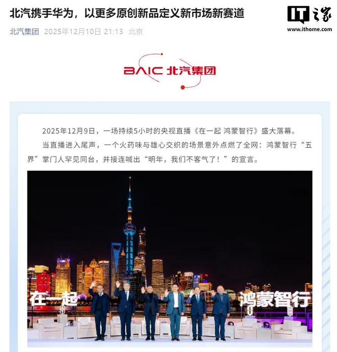 IT之家12月10日消息,在12月9日的鸿蒙智行年度直播中,华为常务董事、产品投资委员会主任、终端BG董事长余承东携手问界、智界、享界、尊界、尚界五大品牌掌门人首次同台。