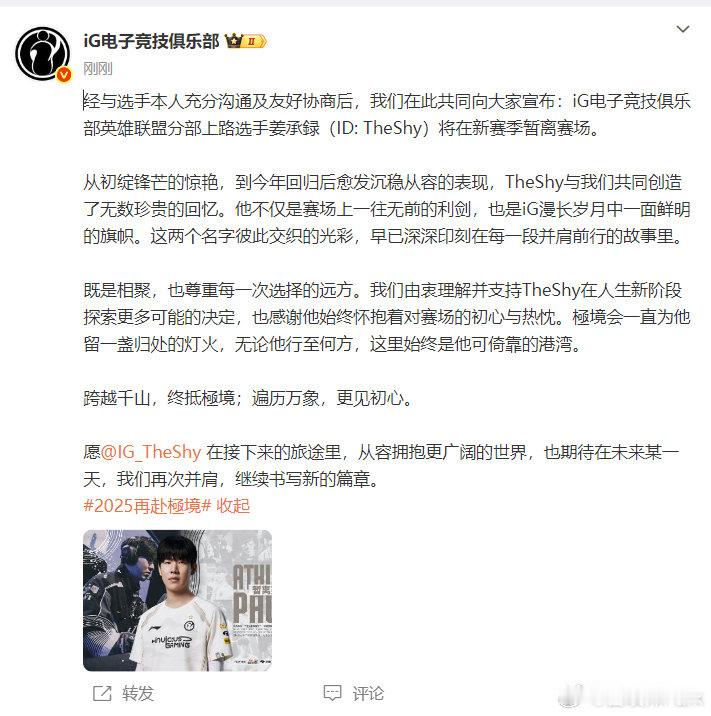 iG今晚的最后一条官宣来了,TheShy暂离赛场!2025年TheShy身披iG战袍,依然是那道劈开峡谷的凌厉锋芒,每一次出击仍带着昔日劈山开海的决绝,却又淬炼出时光赠予的沉静与恢弘。坐镇iG上路,TheShy姜承録让赛事爱好者们看到,最动人的并非巅峰不落,而是传奇穿越风雨,依然能将自己的名字熔铸为赛场上最锋利的那道闪电。那年的青衣白马少年已成宗师,却仍在刀锋上,为所有仰望者镌刻着关于“可能性”的永恒史诗。期待TheShy早日重返赛场,他与iG的故事未完待续!!iG官宣Theshy暂离赛场 TheShy暂离赛场 TheShy官宣暂别赛场
