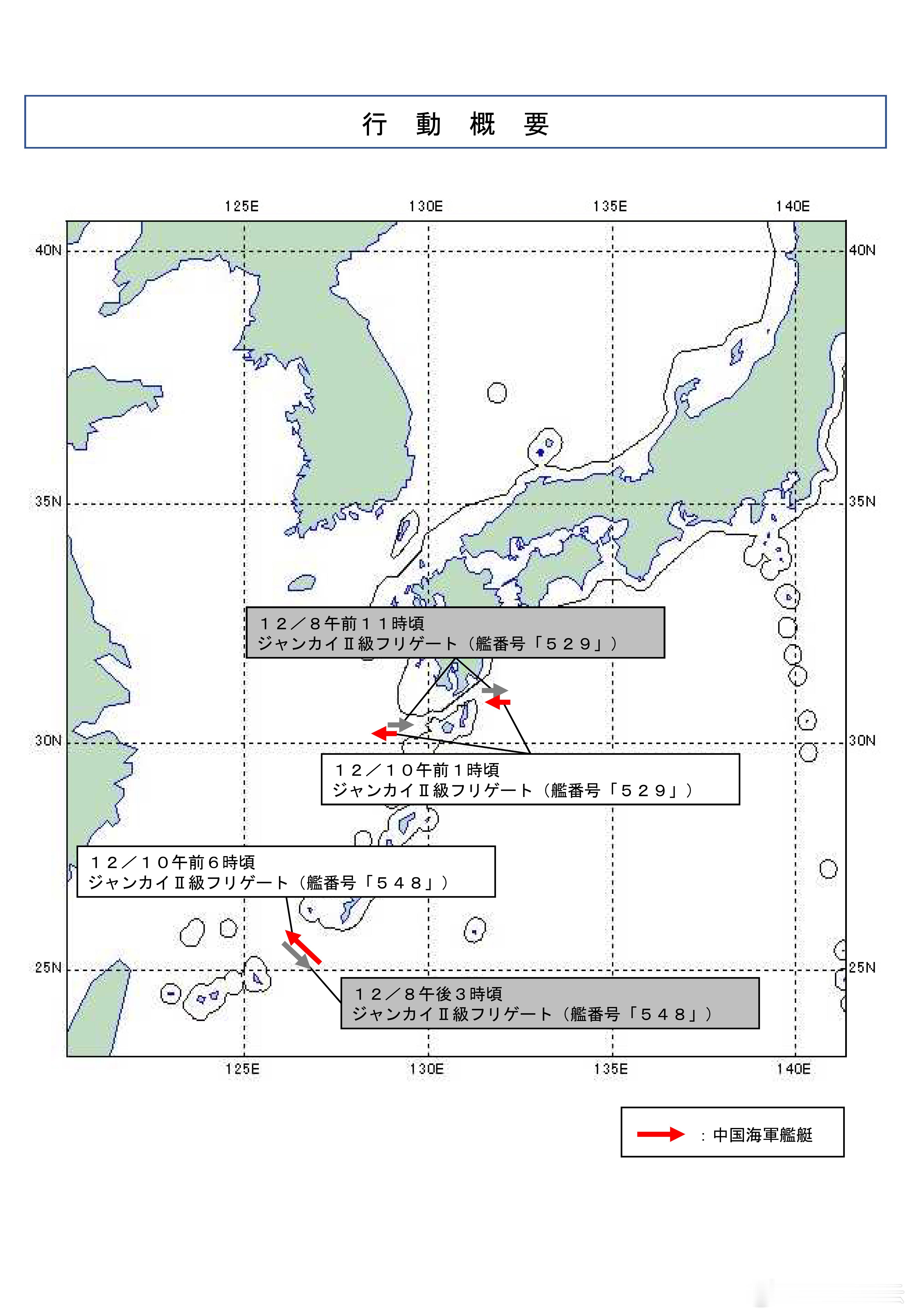 日本防卫省表示:12月10日,中国海军一艘护卫舰向西驶过大隅海峡,驶向东海。同一天,中国海军一艘护卫舰从冲绳岛和宫古岛之间的海域向西北方向航行,驶向东海