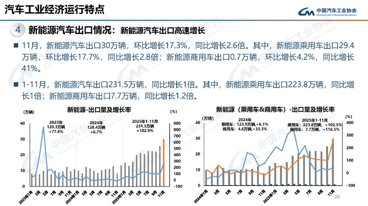 11月,我新能源汽车出口30万辆,环比增长17.3%,同比增长2.6倍。其中,新能源乘用车出口29.4万辆,环比增长17.7%,同比增长2.8倍;新能源商用车出口0.7万辆,环比增长4.2%,同比增长41%。