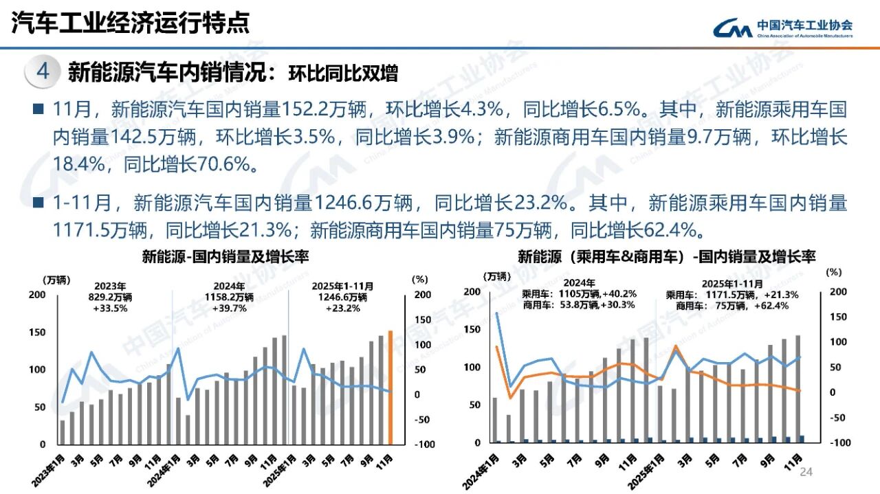 11月,新能源汽车国内销量152.2万辆,环比增长4.3%,同比增长6.5%。其中,新能源乘用车国内销量142.5万辆,环比增长3.5%,同比增长3.9%:新能源商用车国内销量9.7万辆,环比增长18.4%,同比增长70.6%。