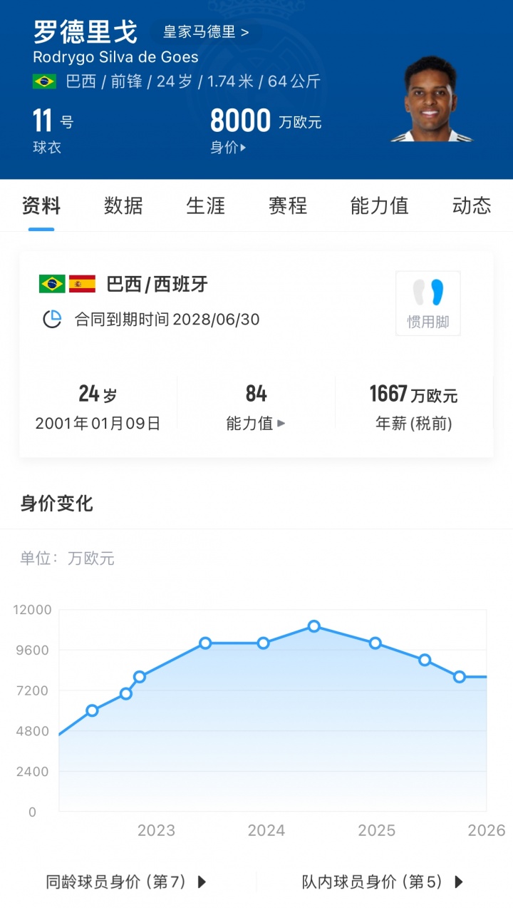 本赛季罗德里戈迟迟无法得到重用,多数时候是作为维尼修斯的替补出场。罗德里戈与皇马的合同2028年到期,他现身价8000万欧,年薪1667万欧在队内排名第五。