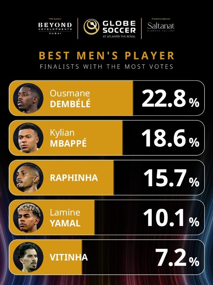 直播吧12月11日讯环球足球奖公布了2025年最佳男足球员的投票情况,登贝莱22.8%领跑,姆巴佩18.6%次席。