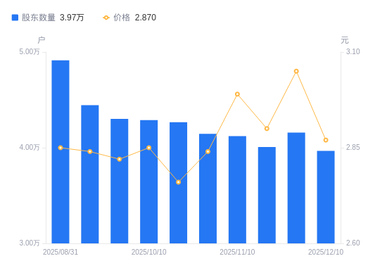 日期A股户数(户)流通A股户均持股数(股)户均持股市值(万元)2025-12-103967833886.379.732025-11-304158432333.199.862025-11-204008033546.499.732025-11-104122032618.719.752025-10-314145732432.249.212025-10-204266831511.758.702025-10-104289231347.188.932025-09-304302331251.738.812025-09-204444430252.538.592025-08-314913627363.717.80