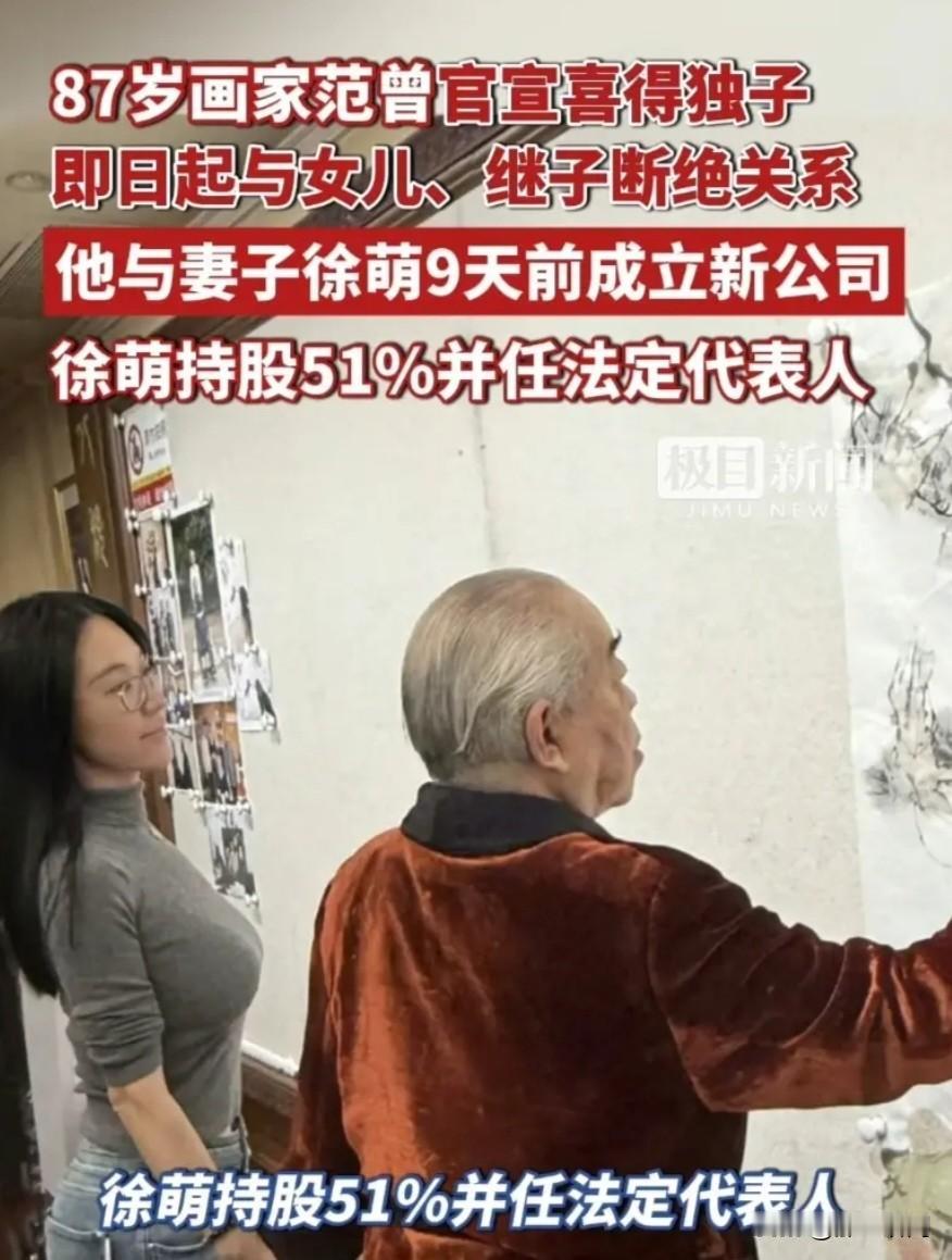 87岁范曾喜得独子,宣布女儿,继子断绝关系,以后与爱妻、独子过。本以为张纪中已经很厉害了,没想到还有个范曾。 12月11日,范曾发文称生了一个独子,又搬了新家,以后因为年岁高了,以后家里的内政和外交,全部交给妻子徐萌了。 有网友评价:我87年的没赶上,你87岁还领到了生育津贴。 他是不是破记录了,87岁还可以当爸爸,还有没有比他更大的呢? 还有网友评价:87年的她选择了87岁的他,真爱啊。 大家怎么看呢?