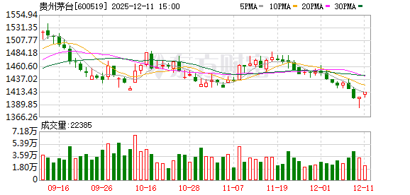 贵州茅台12月11日大宗交易平台出现一笔成交,成交量0.36万股,成交金额498.15万元,大宗交易成交价为1383.75元,相对今日收盘价折价2.00%。该笔交易的买方营业部为中国银河证券股份有限公司北京北四环证券营业部,卖方营业部为东兴证券股份有限公司重庆邹容路证券营业部。