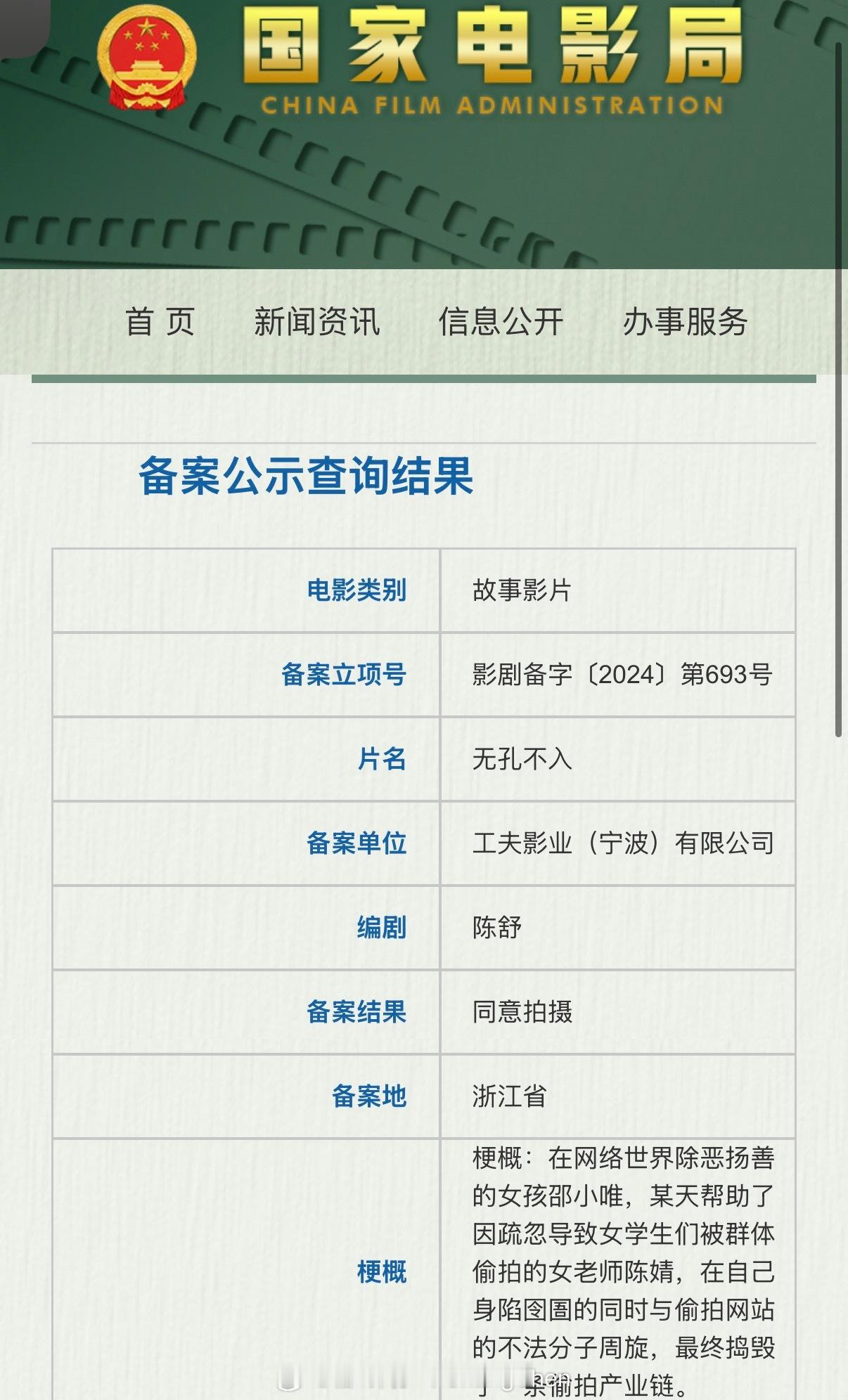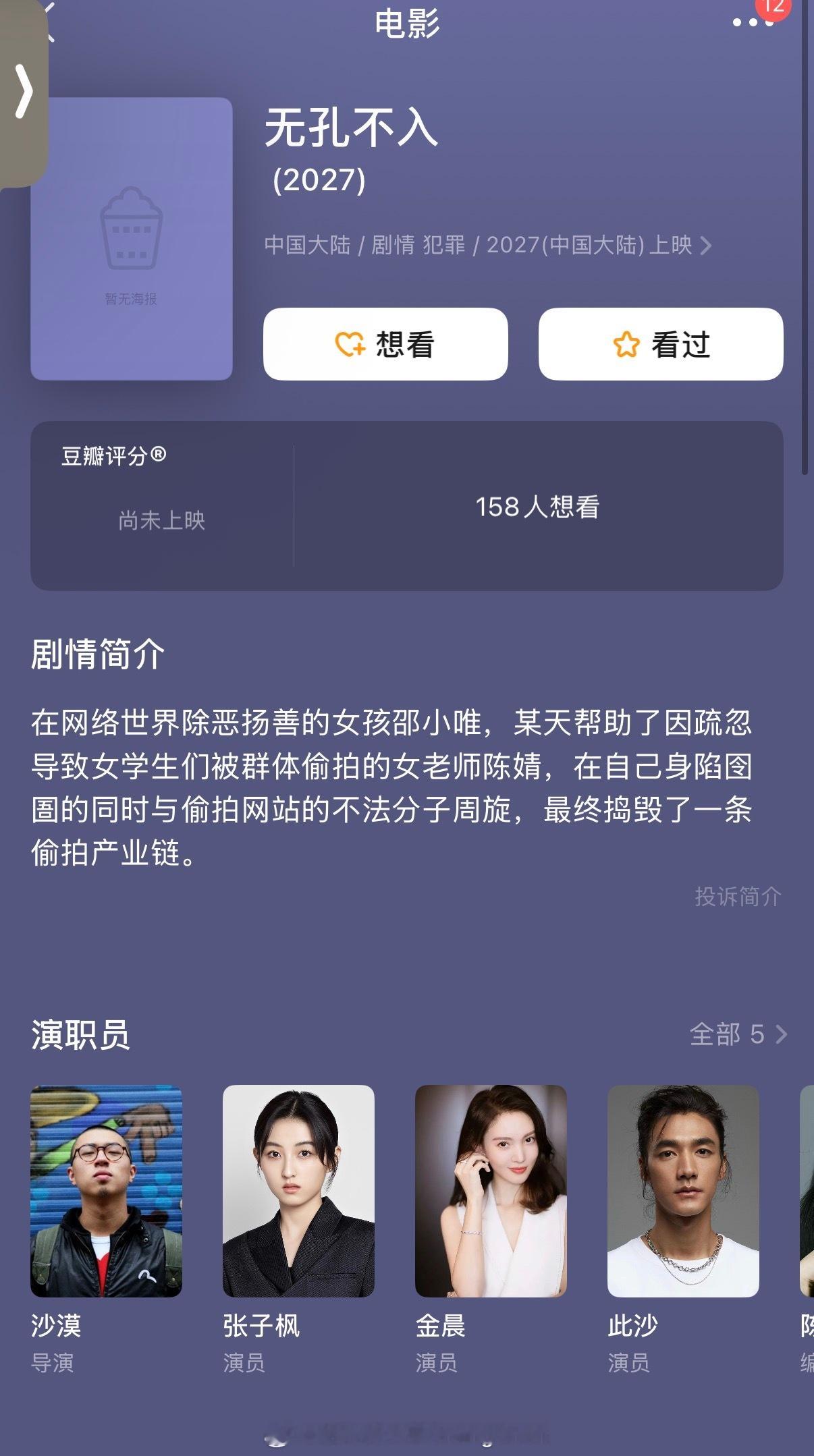 沙漠《你好旧时光》导演的新片《无孔不入》将于下个月在广东开拍。张子枫、金晨、此沙出演,概述:在网络世界除恶扬善的女孩邵小唯,某天帮助了因疏忽导致女学生们被群体偷拍的女老师陈婧,在自己身陷囹圄的同时与偷拍网站的不法分子周旋,最终捣毁了一条偷拍产业链。电影无孔不入跨年电影愿