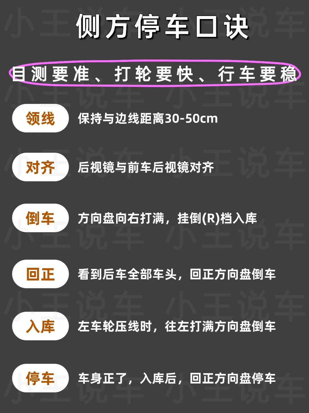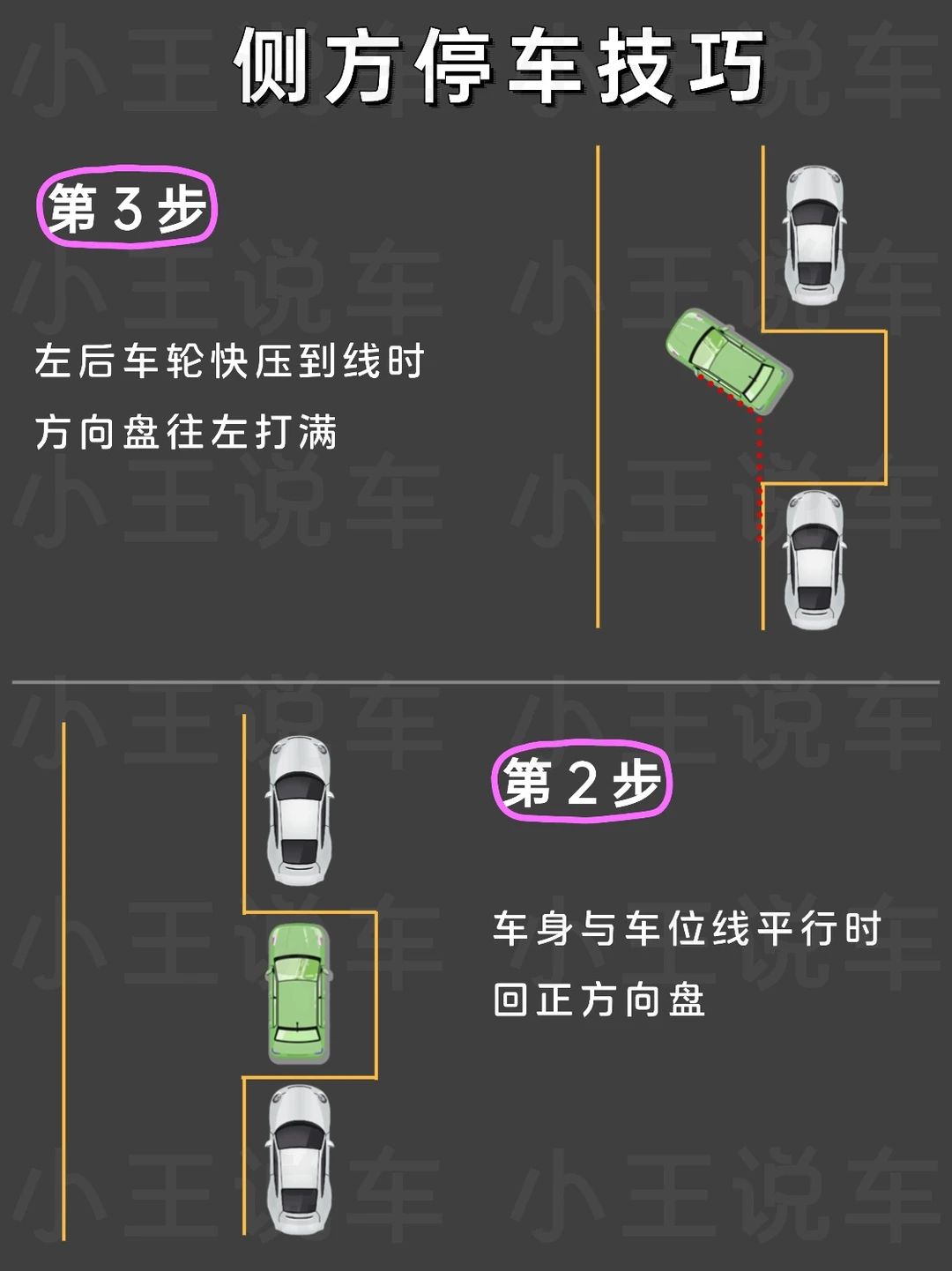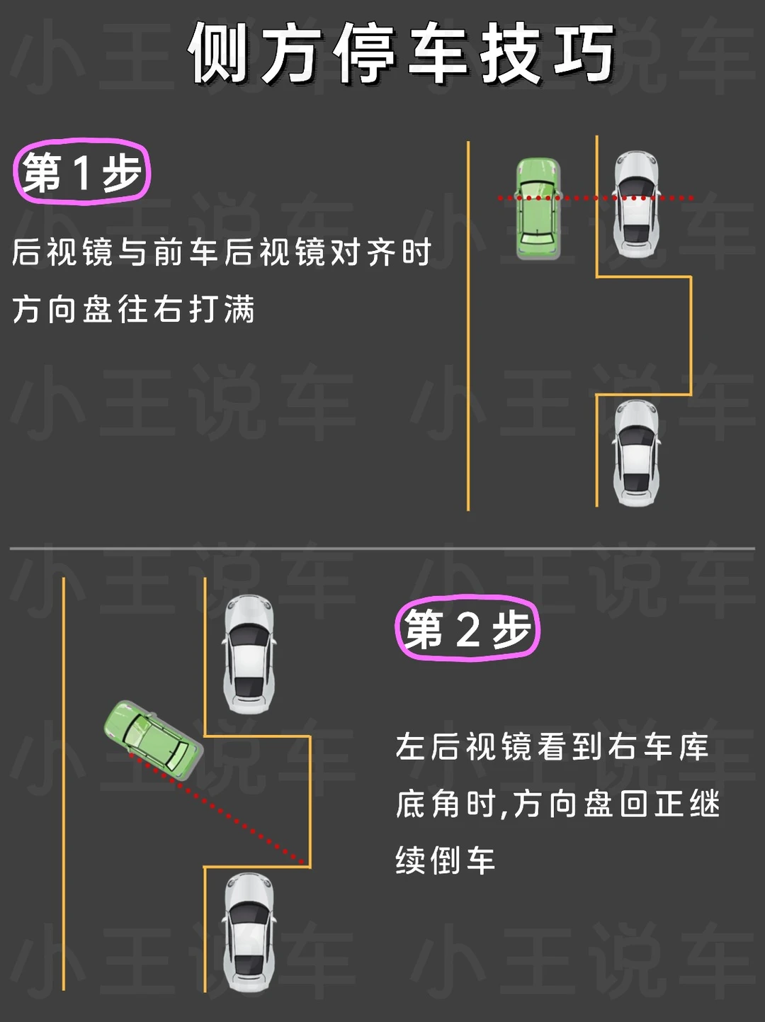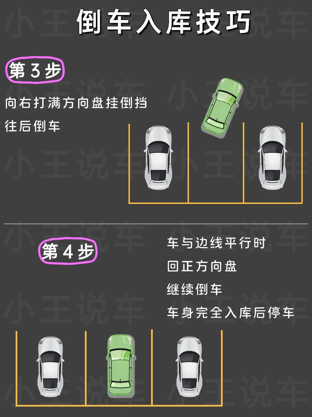 倒车其实不难,掌握技巧就能分分钟搞定👍 - 👉倒车入库技巧 1️⃣第1步 车身距离车库30cm 当右后视镜与边线对齐时 往左打满方向盘往前开 2️⃣第2步 当右后视镜看到库角时 停止前进 往右打满方向盘向后倒 3️⃣第3步 向右打满方向盘挂倒挡 往后倒车 4️⃣第4步 车与边线平行时 回正方向盘 继续倒车 车身完全入库后停车 - 👉侧方停车技巧 1️⃣第1步 后视镜与前车后视镜对齐时 方向盘往右打满 2️⃣第2步 左后视镜看到右车库底角时,方向盘回正继续倒车 3️⃣第3步 左后车轮快压到线时 方向盘往左打满 4️⃣第4步 车身与车位线平行时 回正方向盘 👭学会了吗?