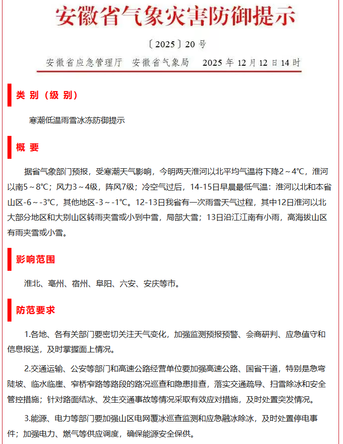 大皖新闻讯安徽省气象部门发布气象灾害防御提示,受寒潮天气影响,今明两天淮河以北平均气温将下降2~4℃,淮河以南5~8℃;风力3~4级,阵风7级;冷空气过后,14-15日早晨最低气温:淮河以北和本省山区-6~-3℃,其他地区-3~-1℃。12-13日安徽省有一次雨雪天气过程,其中12日淮河以北大部分地区和大别山区转雨夹雪或小到中雪,局部大雪;13日沿江江南有小雨,高海拔山区有雨夹雪或小雪。