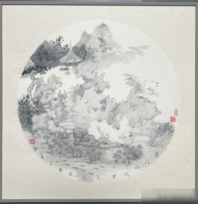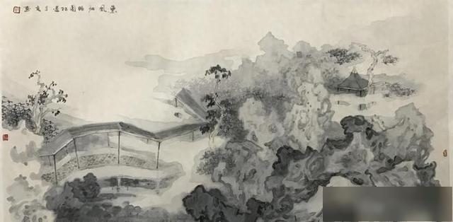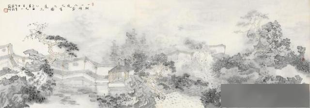 如《雾染园林》的手法表现。通篇色调柔和,墨迹较浅。大量的用水使得画面犹如水中之画,时明时暗,若隐若现。每个细节处,均依稀可见墨色与水的身影,不即不离,相行相伴。其间小桥流水,庭院回廊,百转千回,曲径通幽,透出生机无限。画中远处的亭台楼阁,因为窗户的展现,使其封闭中蕴藉通透,迷茫中含蓄辽远。画的最右侧,一片微白的雾气将景物遮掩,不仅使整幅作品的着色有了阴阳渐变的层次感和雾的神秘感,而且画意纠葛中略带缠绵,给人以言有尽而意无穷的关联,犹如身临“太虚幻境”,充满奇想。