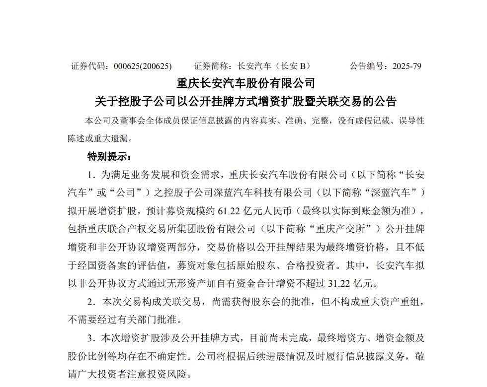 [长安汽车:深蓝汽车拟开展增资扩股,预计募资规模约61.22亿元]长安汽车今晚公告称,公司控股子公司深蓝汽车科技有限公司拟开展增资扩股,预计募资规模约61.22亿元人民币,包括重庆产交所公开挂牌增资和非公开协议增资两部分。