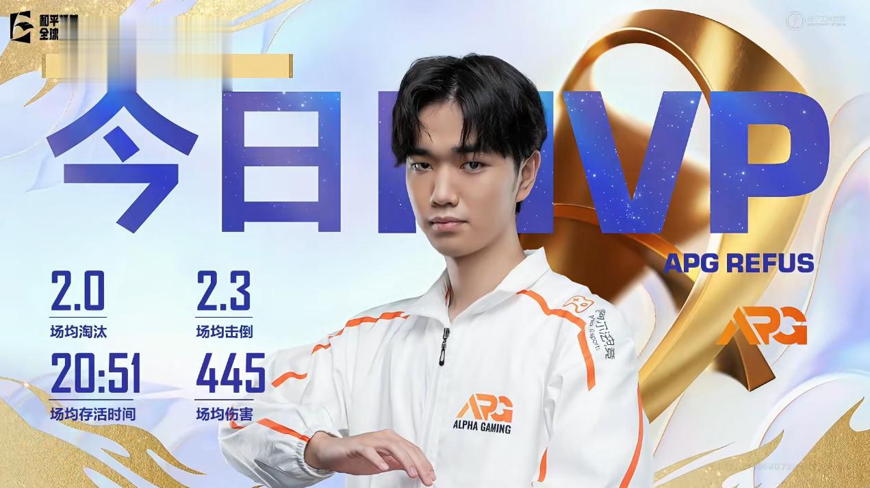 虎扑12月12日讯2025和平精英全球总决赛,恭喜APG-REFUS获得决赛首日MVP!