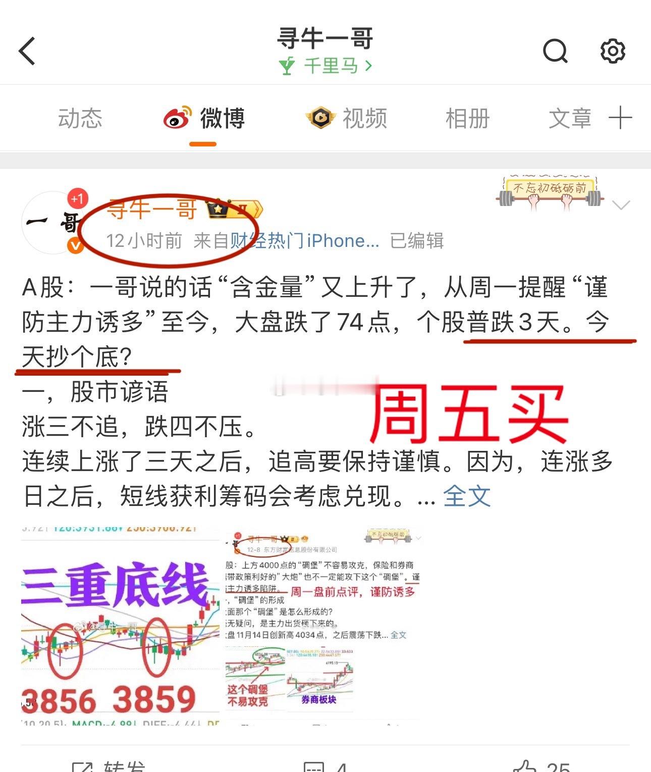 A股:他又封“神”了!(图)周一盘前提示主力诱多,周五盘前提示抄个底。周线穿透,下周怎么看?一,回顾周一开盘前提示,谨防主力诱多陷阱。结果大盘当天冲高回落。彼时的理由比较简单:大盘难以站稳中期均线(MA20/MA30均线)。大盘周一最高点是3936点,刚刚摸到了MA30均线。大盘从周二跌到了周四,每一个交易日,都是个股普跌,场内下跌个股都在3000只以上。时间来到了周五。市场连续下跌,投资者心里七上八下。一哥开盘前提示,今天抄个底。核心理由有两点:1,涨三不追,跌四不压这是今天抄底的短线逻辑,也是短线市场的成本逻辑。2,3860点成为今天的关键3860点区域是三重底线,透露出了主力的狡猾。守住了底线,希望就还在。二,展望把大盘分为两个部分。1,M头结构(图)从10月24日到11月20日,算是M头结构。头顶在4030点一线,柱子脚在3930点一线。顶底差大约是100点。本次下跌低点3816点,与3930点大约也是100点。这不是巧合,这是M头跌破之后的量度跌幅。2,震荡结构M头以下,截止当前,整体上还是震荡结构。这个震荡结构与大盘从8月22日到10月23日的结构相当。这个结构什么时候结束,目前不确定。3,周级趋势分析本周高点3936点,低点3850点,开盘3909点,收盘3889点,下跌13点。上周高点3914点,低点3859点,开盘3894点,收盘3902点,上涨14点。高点高,低点低,小阴包小阳(图)。这种K线组合属于“小穿透”,对多方不太有利。本周成交金额4万亿,上周成交金额3.4万亿。本周放量了,但却是下跌。下周大盘还将试探下方支撑,不确定会不会跌破今天的低点3850点。个人观点,仅供交流,不构成投资建议!理财有风险,投资需谨慎!今日看盘a股股票A股股市分析A股行情