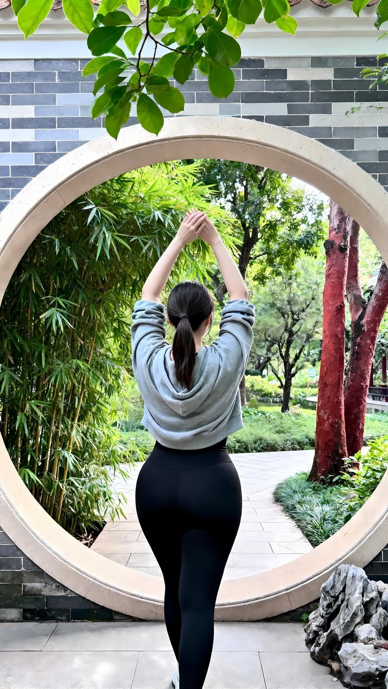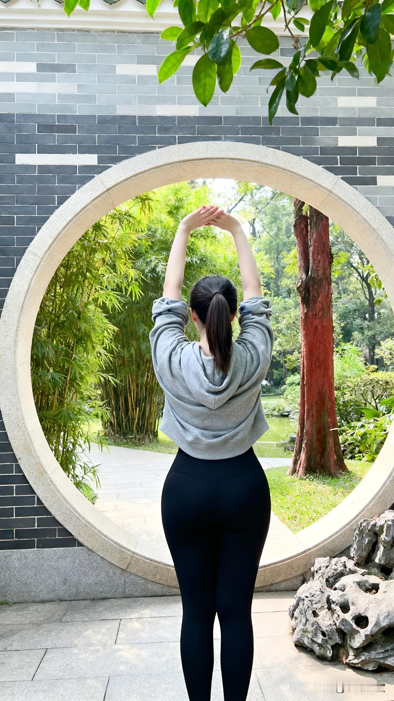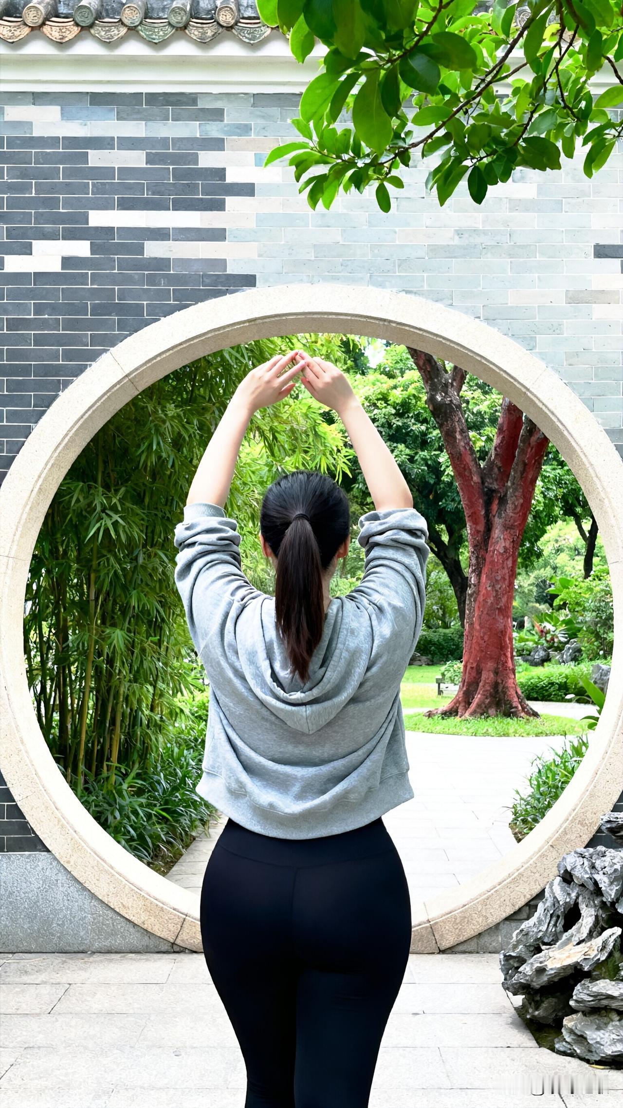瑜伽裤勾勒出流畅的腿部与腰臀线条,灰黑搭配解锁松弛感! 灰色短款卫衣搭配黑色紧身瑜伽裤,将运动休闲风与新中式庭院的雅致完美融合。 短款卫衣慵懒随性,露腰设计暗藏小性感,瑜伽裤则利落勾勒出流畅的腿部与腰臀线条,扎起的高马尾更添活力。 立于圆月形花窗之前,抬手舒展的姿态松弛又自在,翠竹红树作背景,将现代运动的动感与古典园林的静谧撞出独特韵味。这套简约的灰黑搭配,不仅是日常穿搭的舒适之选,更在中式景致里拍出了氛围感大片~ 瑜伽裤穿搭 瑜伽裤搭配 你觉得女人最重要的是美貌还是人品
