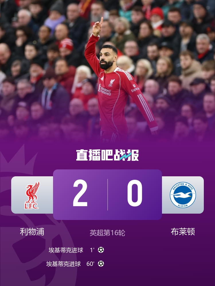 埃基蒂克梅开二度,萨拉赫助攻,利物浦2-0布莱顿。