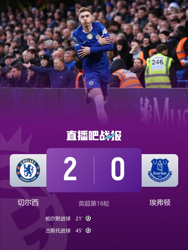 霍尔伤退,帕尔默、古斯托破门,切尔西2-0埃弗顿。