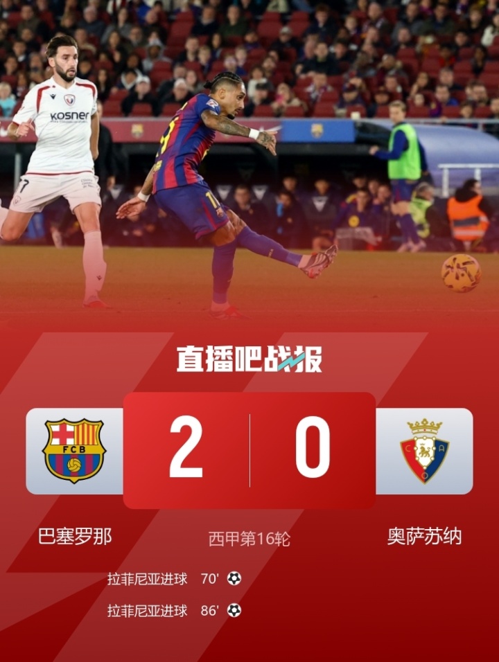 拉菲尼亚双响,巴萨2-0奥萨苏纳,各赛事五连胜先赛7分领跑。