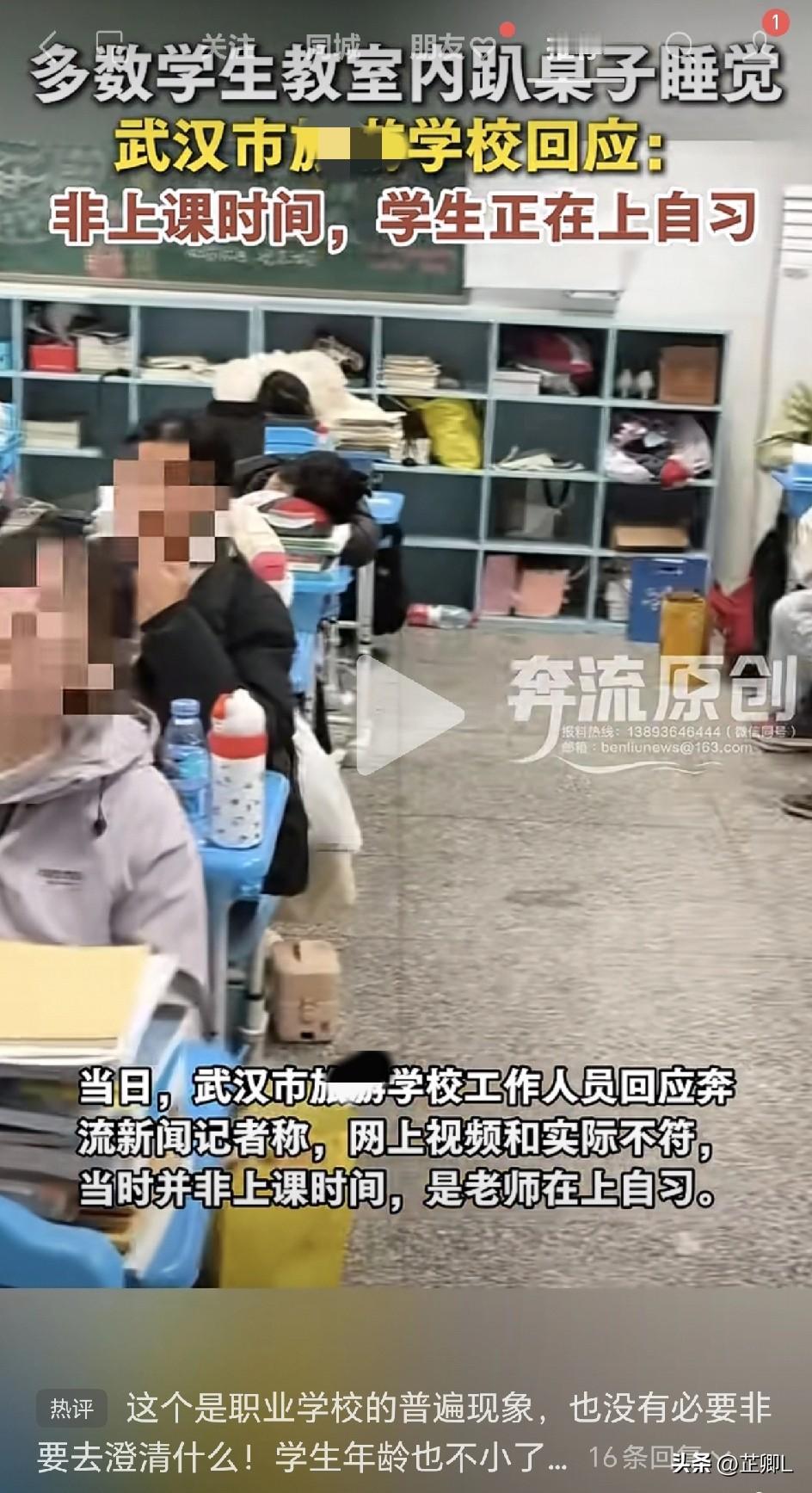 全班40人趴倒一片!老师讲台淡定录视频:说重了被投诉,说轻了就这效果!学校:不是上课是自习!网友:自习课是用来睡觉的? “上课?这分明是午睡现场!”12月12日,一则武汉某职校教室视频突然刷屏。 镜头扫过——5排学生几乎全趴桌,有人翘二郎腿“躺平”,有人戴着耳机沉浸式“修仙”,还有人交头接耳开茶话会。拍摄者不是别人,正是讲台上那位“淡定”的代课老师。 老师亲自曝光:技能高考班专业课竟变“睡仙大会”! 视频标题直接开怼:“武汉市某职校升学班上课状态!”发布者更在评论区自曝身份:“我就是讲台上拍视频的老师。” 他强调这是上午第二节课,技能高考班正在上专业课,进行考证复习。 网友瞬间炸锅: “学风太差!不如回家睡!” “老师怎么不管管?” “这是午休时间吧?” 老师的回复却透着一股无奈:“说重了,会投诉;说轻了,就像视频中这样,默然处之。”——好家伙,原来老师不是不想管,是管不动! 学校紧急回应:不是上课!是自习! 眼看事情闹大,学校工作人员火速回应:“视频内容和实际不符!那是自习时间,不是上课!”并透露这位老师是临时来代课的,校方已着手处理。 但被问到“自习能不能睡觉”时,工作人员却打起了太极。 公开资料显示,这可是所“省级示范中职学校”。有网友调侃:“示范的难道是睡眠质量?” 这事儿看似滑稽,却戳中不少职校老师的痛处:管严了,学生投诉;不管了,家长骂街。那位录视频的老师,或许正是用这种“行为艺术”表达无奈。 而学校的回应,也透着常见的“危机应对逻辑”——先否认,再解释,最后“正在处理”。 睡倒一片的教室,到底是学生太累,还是课堂无趣?是管理松懈,还是教育方式该换换思路? 这场“罗生门”里没有赢家——学生被贴上“懒散”标签,老师被质疑“不作为”,学校名誉受损。 职业教育本就面临偏见,此类事件无疑雪上加霜。 但换个角度看,这或许是个契机:如果课堂足够吸引人,何愁学生“梦游周公”?如果管理既讲原则又有温度,何来“管与不管”的两难? 很多孩子只是学习不好,但本性纯良。很多时候,他们只是没有找到生活的目标,只是面对未知的未来心生迷茫,所以才选择躺平。 对比普高的学生,职高的学生或许更需要的是职业规划和心理导师。 他们因为学习不好,所以自动或者被动进入职高,在不懂职业规划的年龄选择了专业方向。 社会给他们贴上“坏学生”的标签,家长对他们失望至极,他们只能用躺平、用各种“标新立异”来表达抗拒。 所以,在谴责他们的同时,我们的社会也需要考虑怎么用他们能接受的方式,教会他们一技之长;让他们能寻找到自己未来的方向。 没有谁天生喜欢承受别人鄙夷的目光,他们需要的是一束可以指引前行的光,一缕安抚心灵的春风,一句温暖身心的良言! 如果你是老师,面对一教室“睡神”,你会怎么办? 欢迎在评论区聊聊你的看法! 信息来源于奔流新闻,侵联删!