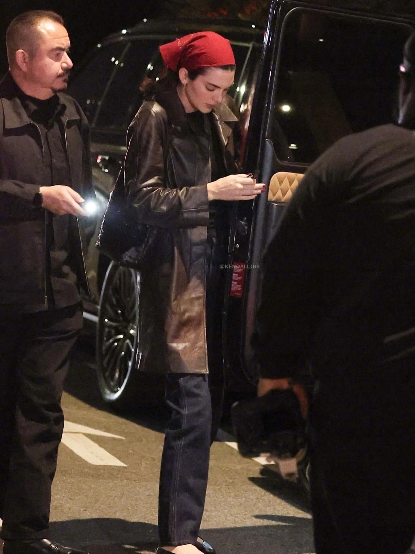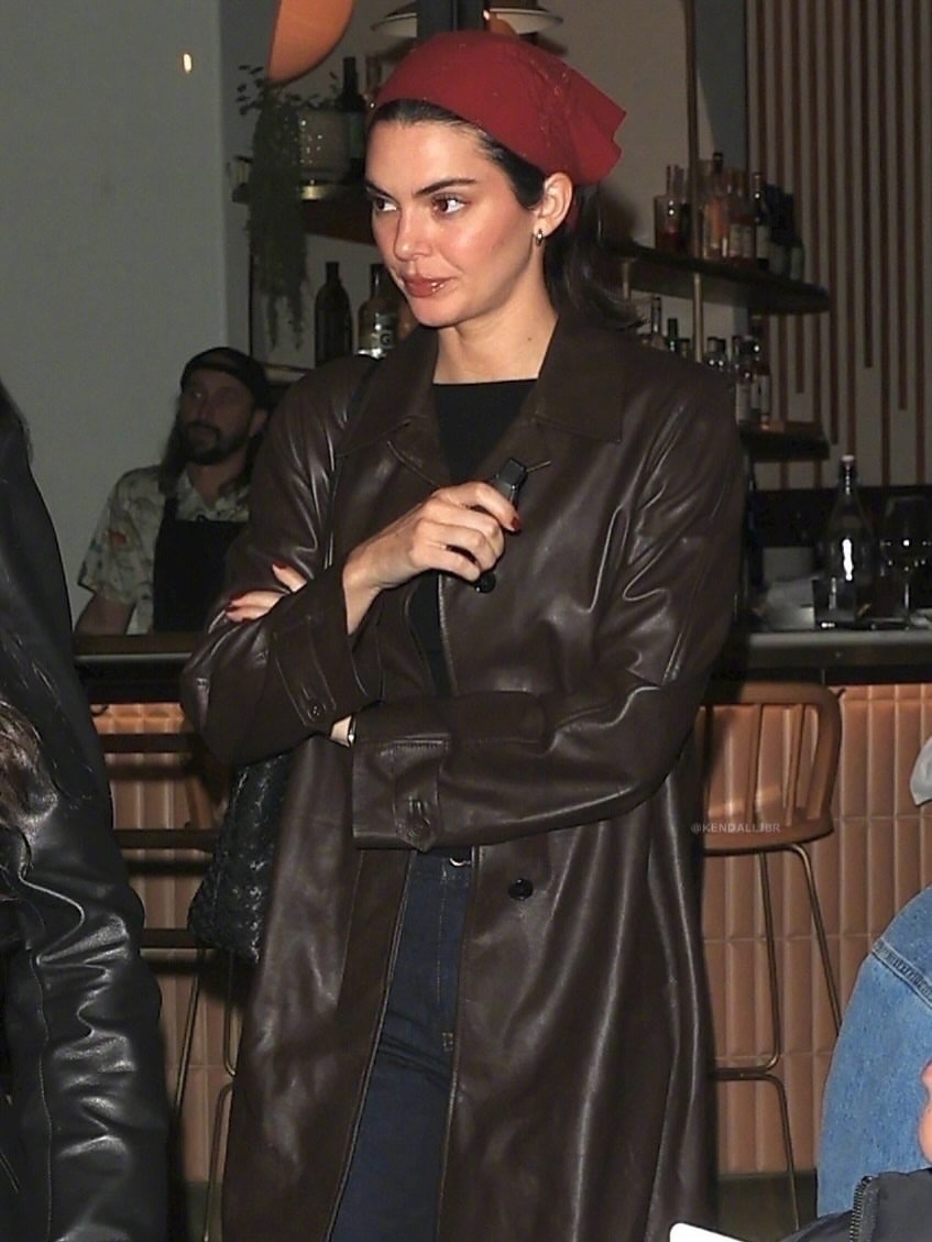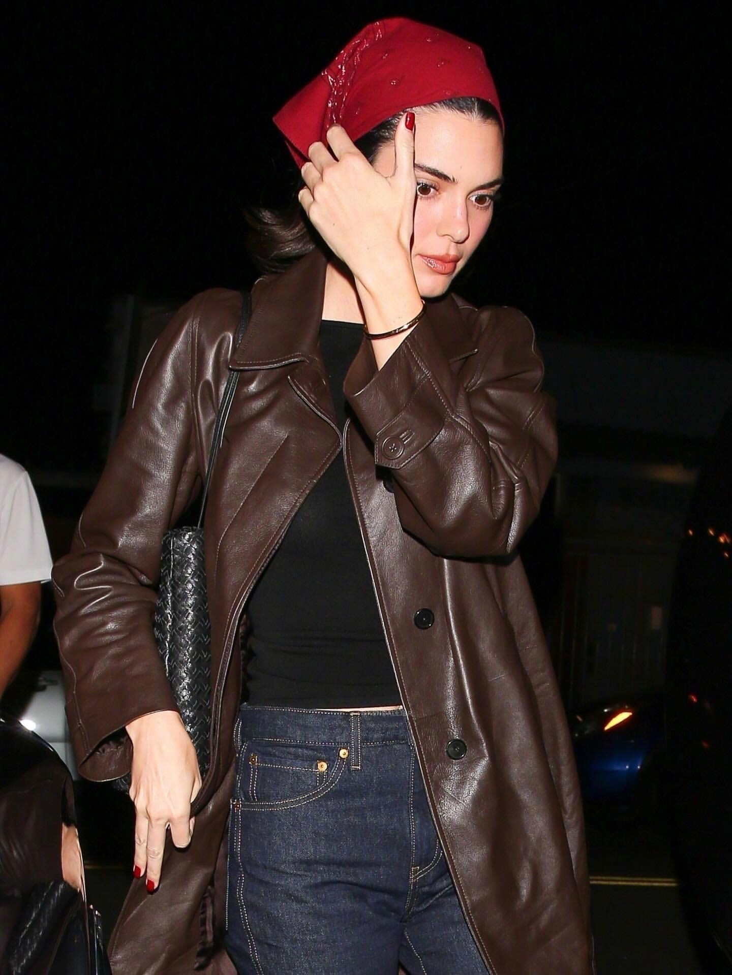 Kendall Jenner 在加州洛杉矶离开的Saffy’s 餐厅的街拍。 这红色包头巾一戴,很有田园风了。