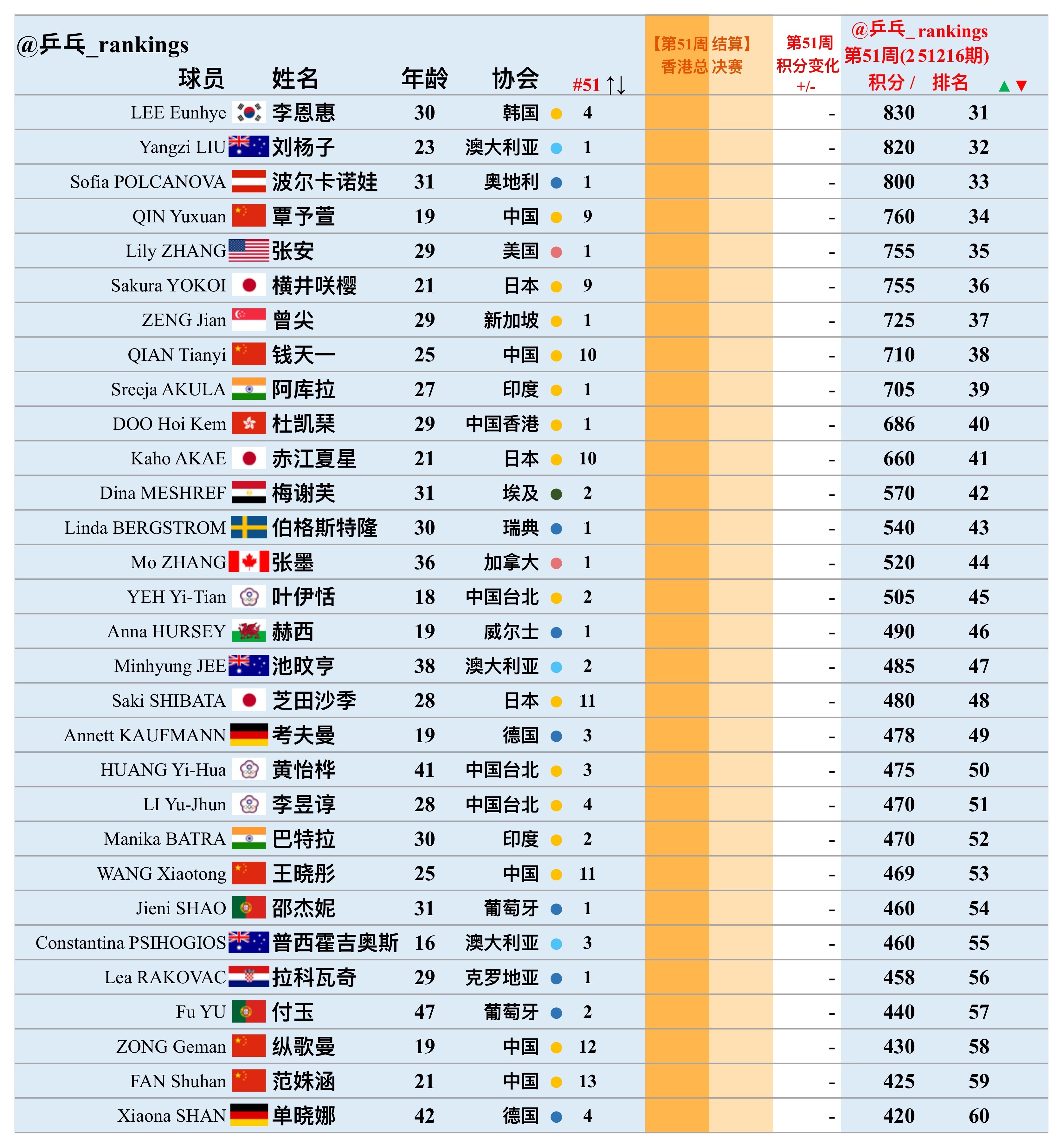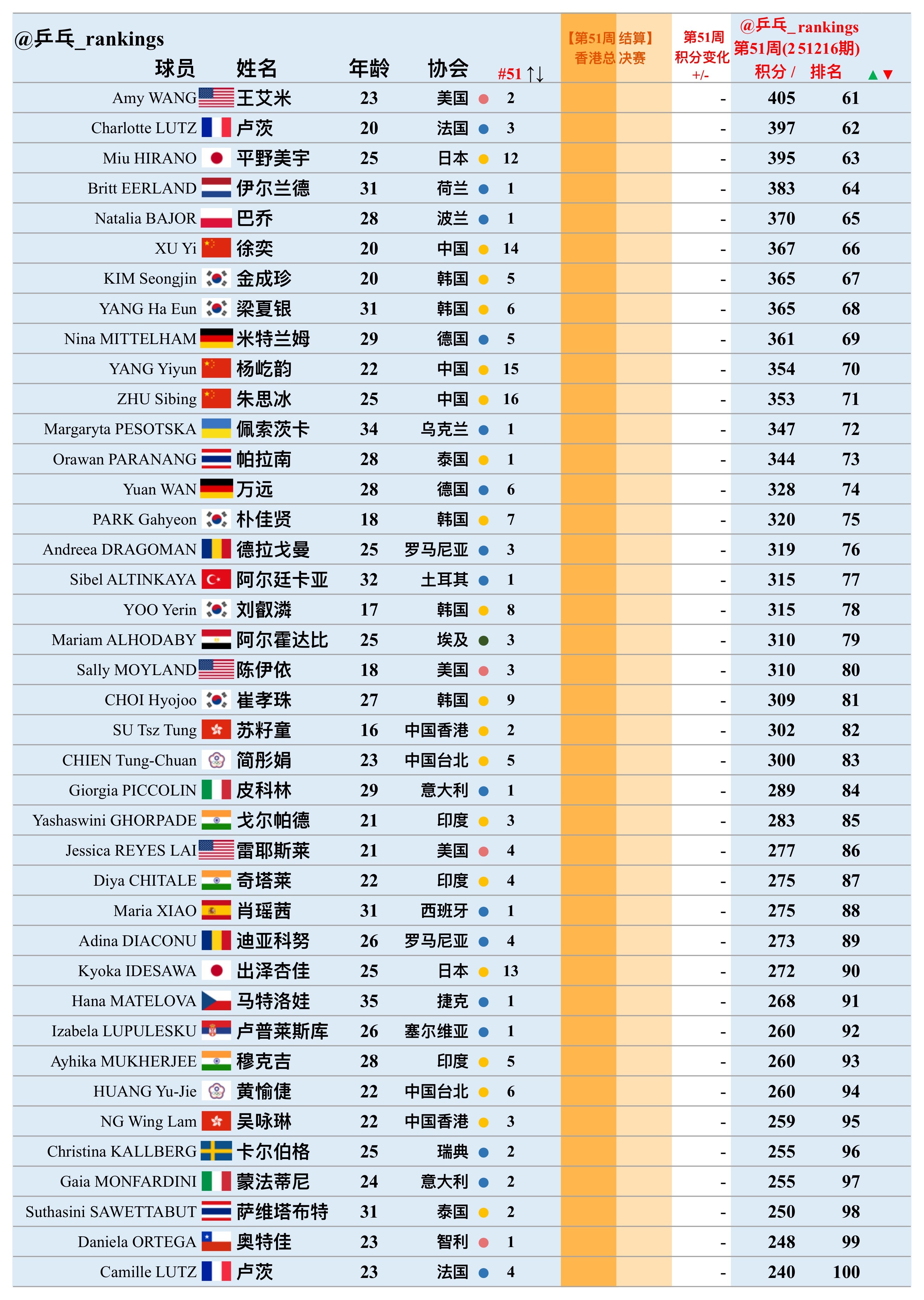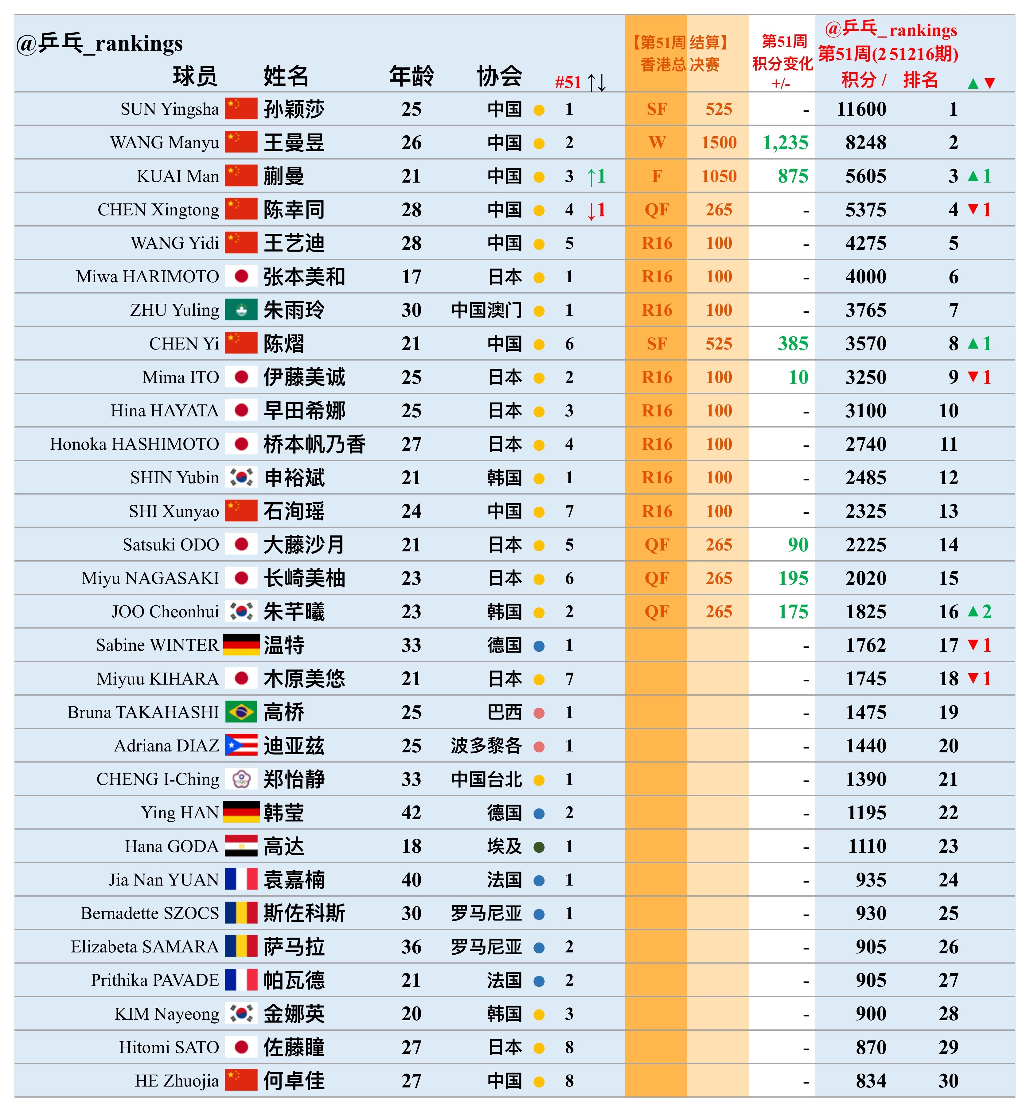 第51周世排积分变化(20251216期)【女单】🔺本周结算• WTT香港总决赛2025🔻本周失效• 无【积分排名数据仅供参考,以最终实际为准】