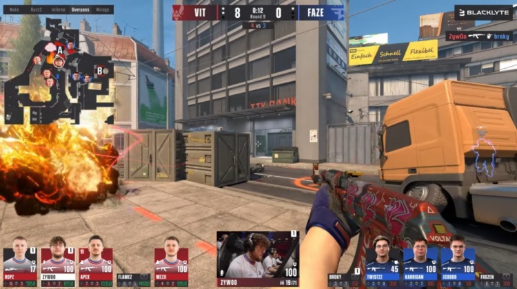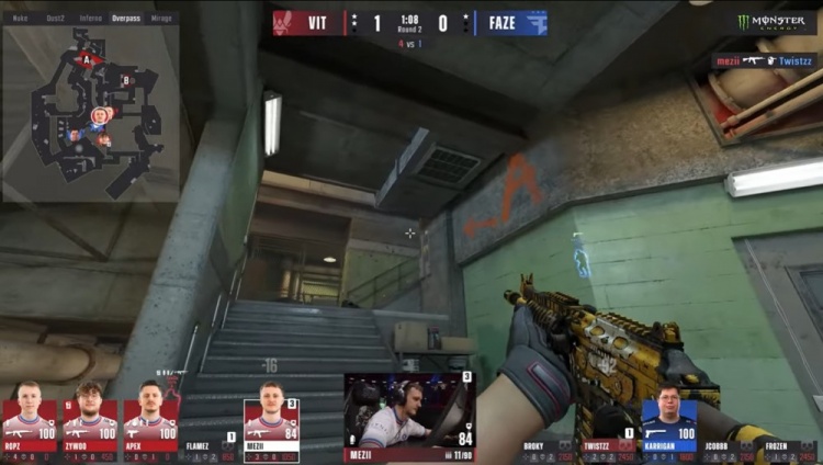 第12局broky厕所大狙轰掉mezii,总监A小击杀ropz后回到A点击杀Zywoo帮助FaZe拿到首分,VIT11-1FAZE。