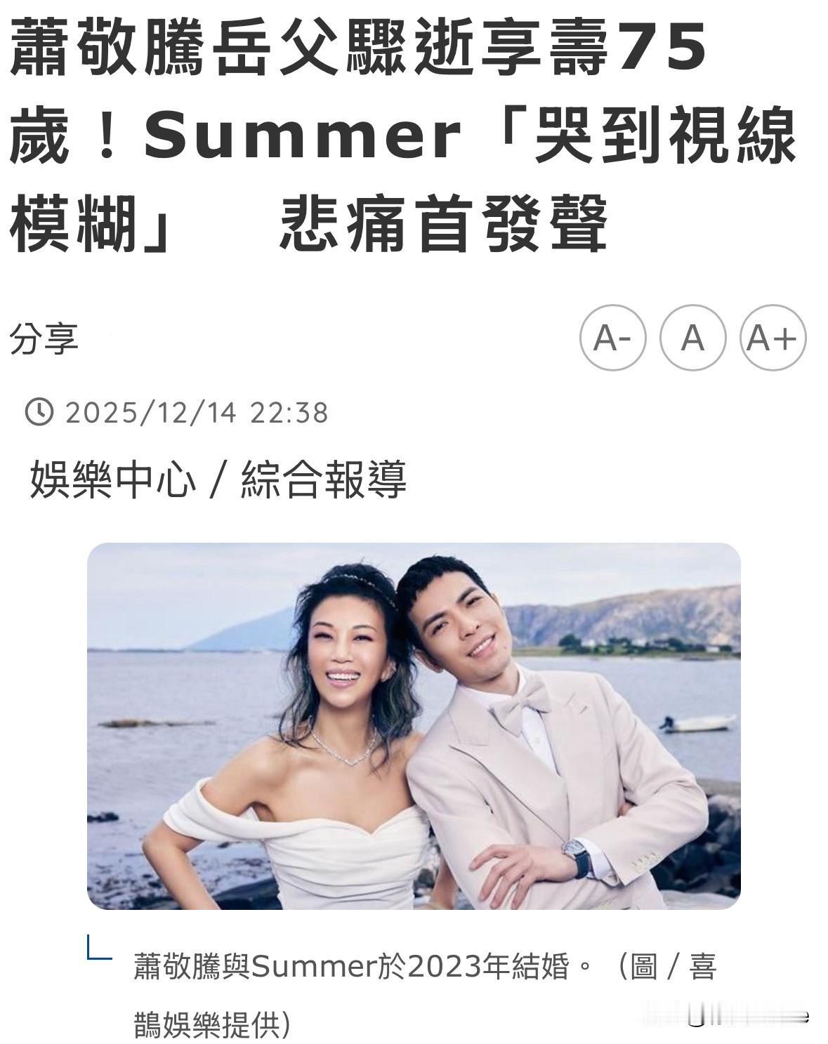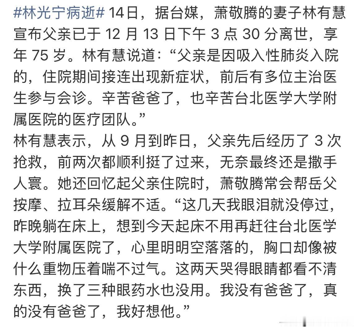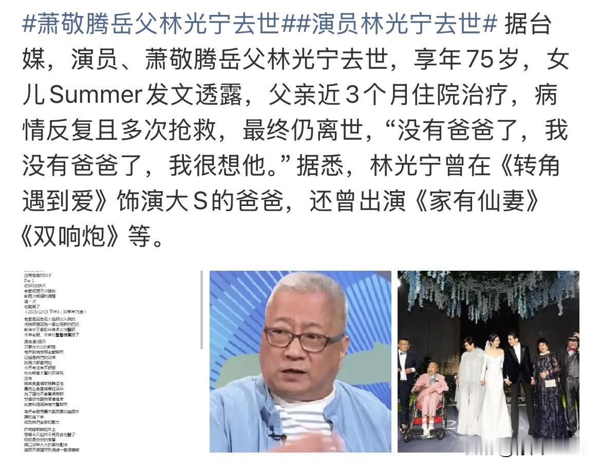 12月15日,Tm报道萧敬腾岳父,林有惠父亲林光宁骤逝,享年75岁,圈内人士纷纷致哀! 曾在《转角遇到爱》中饰演大S的父亲! 林有惠悲痛发声,胸口像被重物压的喘不过气,直言我好想他!家属于12月15日商讨灵堂及追思会事宜,暂未公开具体安排! 萧敬腾