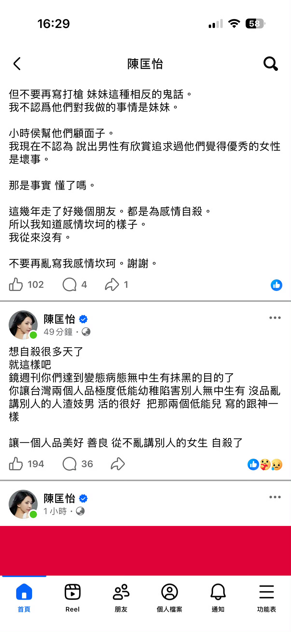 陈匡怡发文想轻生上大学的时候挺喜欢她的,一转眼都十几年过去了。出道的时候是顶着小周慧敏的名头,演过几部影视作品,但是角色不讨喜,演技也有点尬,后来就没太多声音了。之前看过她的ins的一些内容,感觉精神状态确实一般。今天才知道原来她2017年就因为精神状态不好退圈了。八卦媒体确实很垃圾,特别是港台的,没啥好的办法。只能说尽量提升自己的精神状态,现在也不拍戏了,彻底退网可能是更好的选择。老张杂谈