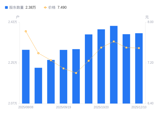 日期A股户数(户)流通A股户均持股数(股)户均持股市值(万元)2025-12-102380921210.7915.892025-11-282376721248.2715.942025-11-202413520924.2915.942025-10-202398121058.6615.792025-10-102375721257.2115.392025-09-302310721855.1815.302025-09-192307221888.3315.522025-09-102262922316.8316.182025-08-292228122665.3916.752025-08-082307521885.4917.11