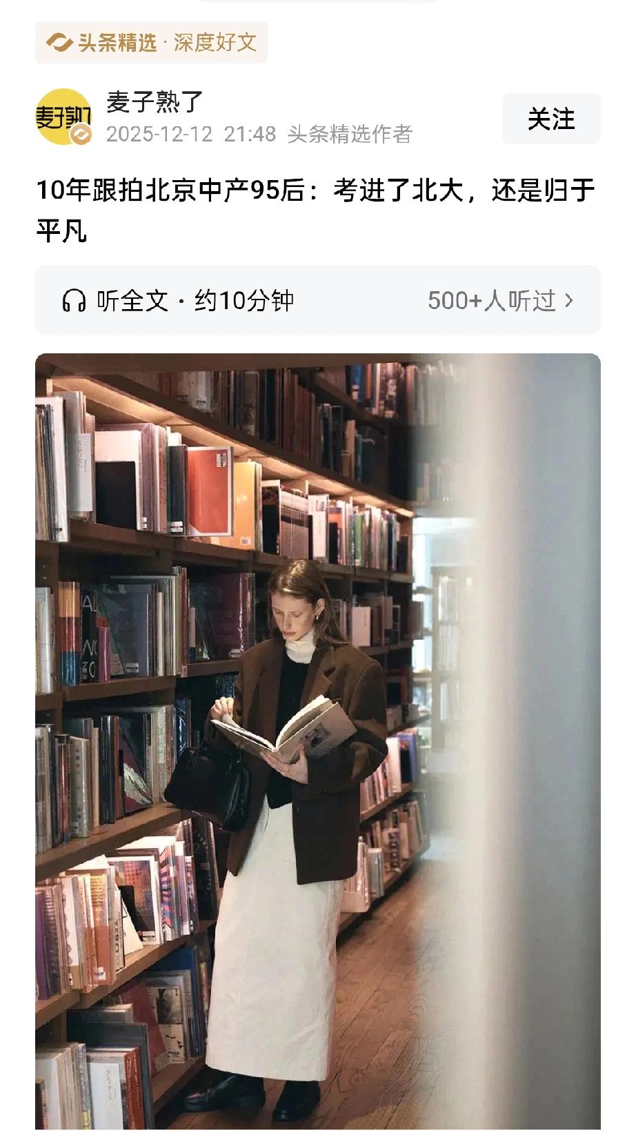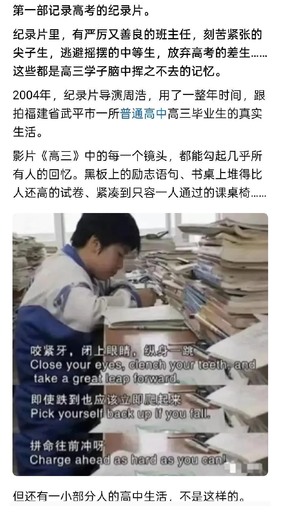 “考进了北大,还是归于平凡”这话题很能引人深思。就像纪录片《高三》,记录普通中学高三生的紧张备考,黑板励志语、堆积如山的试卷都是回忆。而《真实生长》跟拍北京中产学生10年,那里教育模式先进,学生能自主安排,和传统高三很不一样。这两部纪录片形成了鲜明对比,让人看到不同教育环境下学生的成长轨迹。《高三》里的学生们在应试压力下拼命刷题,只为了那一张通往大学的门票,他们的未来在分数的指挥棒下充满不确定性,即便考上北大清华这样的名校,也可能在未来的人生旅途中归于平凡,因为社会竞争是全方位的,一纸学历并非万能钥匙。 而《真实生长》中的中产学生,在丰富多元的教育资源下成长,他们能发展自己的兴趣爱好,提前进行职业规划。但他们的成长也并非一帆风顺,在自由的环境中也要学会自我约束和选择。 “考进北大,还是归于平凡”,其实平凡是人生的常态。北大只是一个起点,它可能给人更高的平台,但不能决定一生的成就和价值。无论身处何种教育环境,都要在成长中不断思考和探索自我,找到真正属于自己的道路,在平凡中也能绽放独特的光彩。