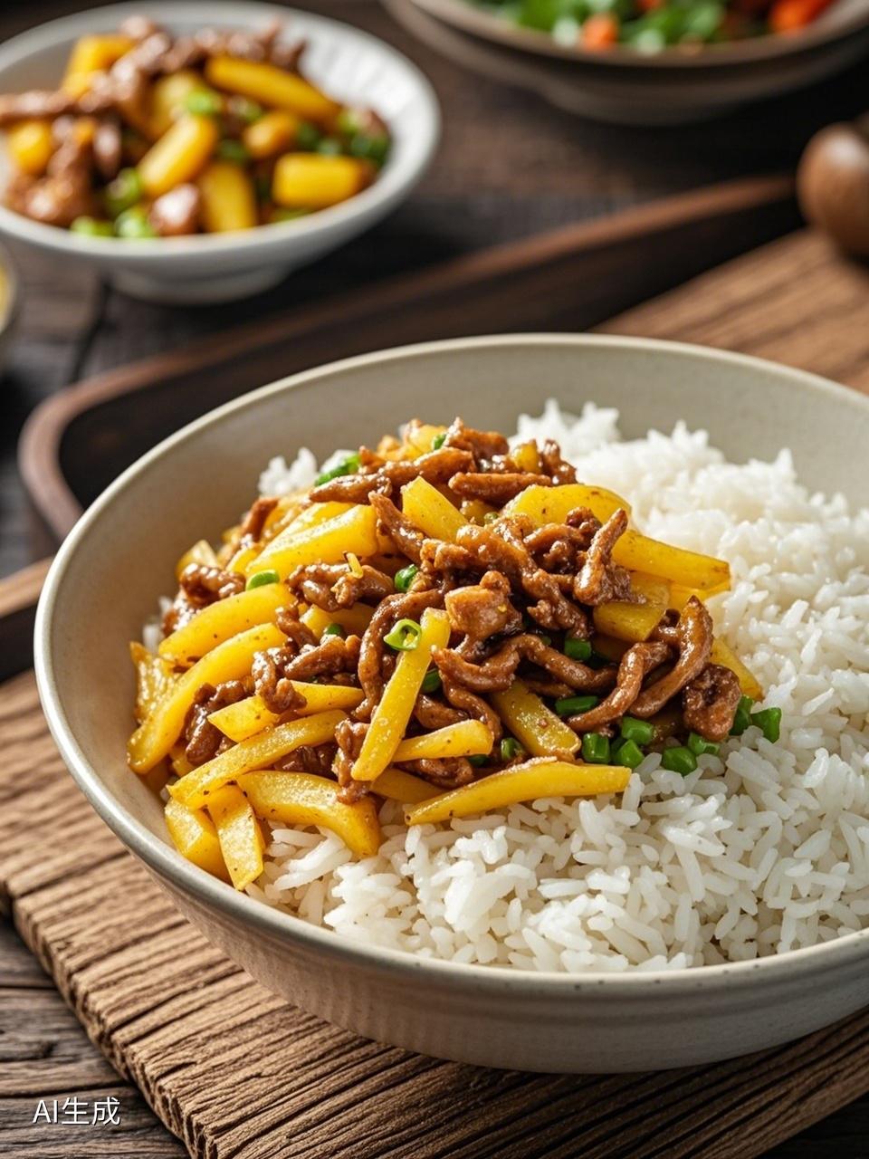 今日美食必须得晒!我做了上班族快手养生餐——土豆肉丝+清炒扁豆丝盖饭。这可是我试了无数次的宝藏餐,15分钟搞定,低盐低脂超下饭。 食材也简单,一个中等土豆、80g猪里脊、150g扁豆,再加些葱花、蒜末就行。土豆富含钾和膳食纤维,猪里脊是优质蛋白,扁豆有多种维生素,三者搭配营养均衡。 做法也不难,土豆丝冲洗掉淀粉更脆还防粘锅。全程少油少盐,吃着没负担,厨房新手也能零失败。强推给各位打工人! 心动不如行动,大家跟着我这详细步骤做起来。先把猪里脊切丝,用生抽、料酒、淀粉抓匀腌制。土豆和扁豆也切丝,土豆丝多冲几遍水。 起锅热油,放葱花、蒜末爆香,下腌制好的肉丝滑炒至变色盛出。接着锅中再添少许油,放入土豆丝煸炒,炒到微微透明,加入扁豆丝一起翻炒。 扁豆丝断生后,把肉丝倒回锅中,加盐、鸡精调味,快速翻炒均匀。最后把炒好的菜盖在米饭上,一份香喷喷的土豆肉丝清炒扁豆丝盖饭就大功告成啦! 吃一口,土豆丝爽脆,扁豆丝鲜嫩,肉丝滑嫩,米饭吸满了菜汁,太满足了。打工人的每一餐既要吃得好又要省时,这道快手养生餐绝对是不二之选,赶紧试试吧!