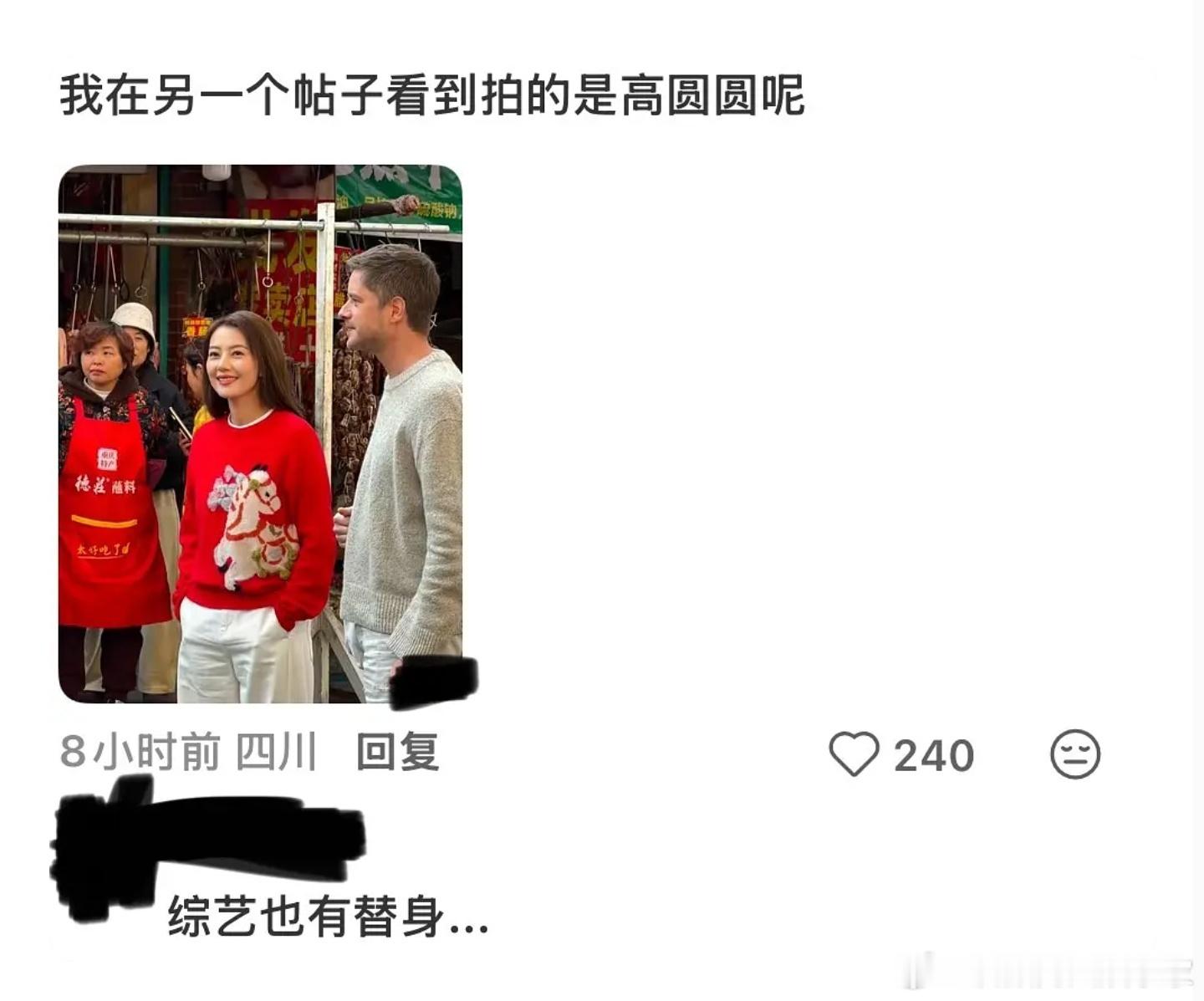 其他人去提前调.试灯光,这样演员到了就能直接拍,不用重新找光了。人家节目组也是为了不妨碍街道的交.通和人.流啊,提前来试镜头,更节省时间,不然后.期也麻烦。这在很多行业都有吧,不用大惊小怪的。高圆圆也是硬美,路人都忍不住停下来围观高圆圆 综艺替身综艺也有替身了